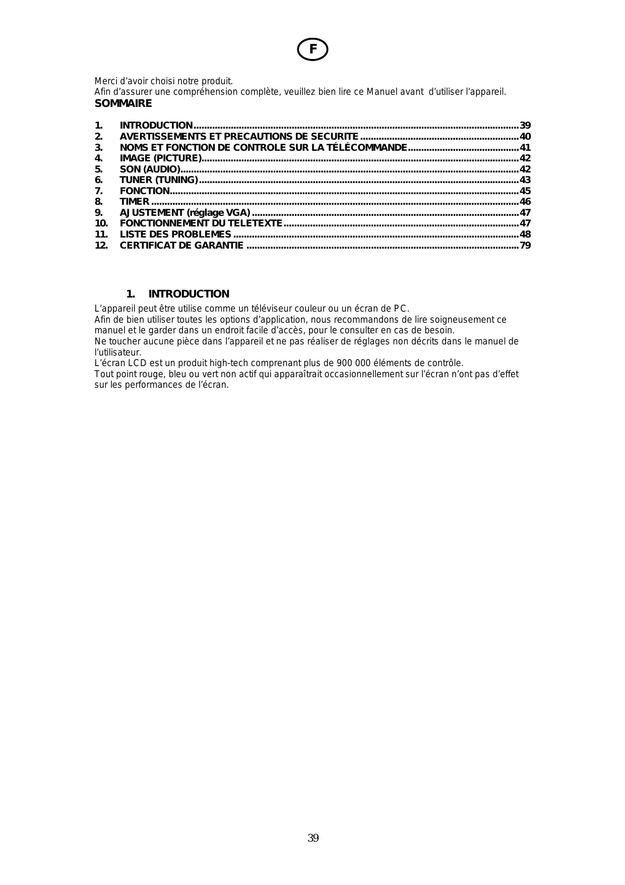 L’appareil peut être utilise comme un téléviseur couleur ou un écran de PC. Afin de bien utiliser toutes les options d’application, nous recommandons de lire soigneusement ce manuel et le garder dans un endroit facile d’accès, pour le consulter en cas de besoin. Ne toucher aucune pièce dans l’appareil et ne pas réaliser de réglages non décrits dans le manuel de l’utilisateur. L’écran LCD est un produit high-tech comprenant plus de 900 000 éléments de contrôle. Tout point rouge, bleu ou vert non actif qui apparaîtrait occasionnellement sur l’écran n’ont pas d’effet sur les performances de l’écran.