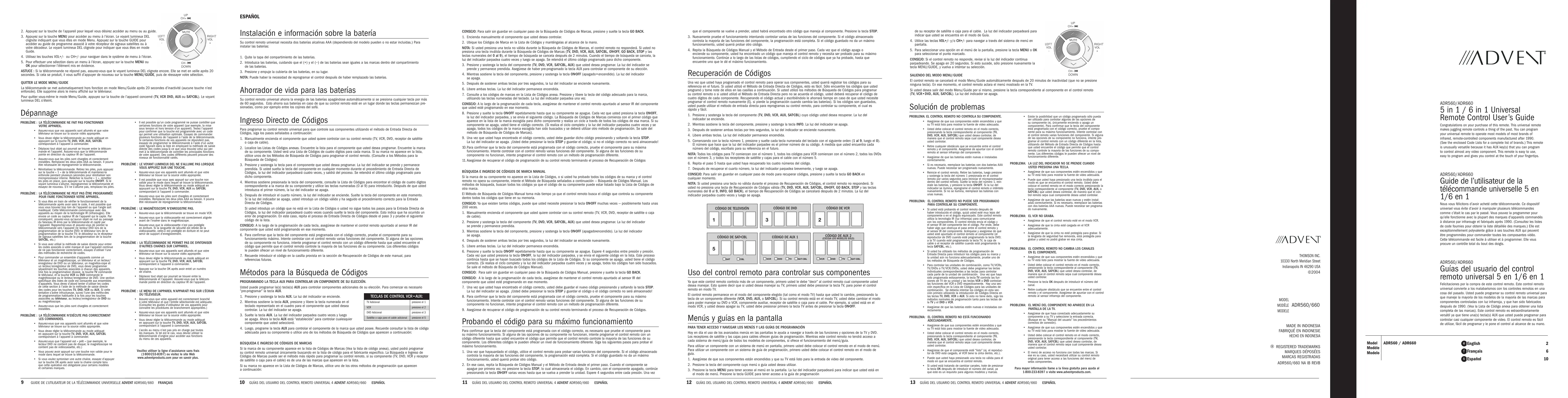 - L’accès au menu n’est pas pris en charge par toutes les marques. Si tel est le cas, vous devrez utiliser la télécommande d’origine pour accéder aux fonctions du menu de ces appareils. Veuillez utiliser la ligne d’assistance sans frais (1·800·233-8397) ou visitez le site Web www.adventproducts.com pour en savoir plus. GUIDE DE L’UTILISATEUR DE LA TÉLÉCOMMANDE UNIVERSELLE ADVENT ADR560/660 FRANÇAIS Ingreso Directo de Códigos Para programar su control remoto universal para que controle sus componentes utilizando el método de Entrada Directa de Códigos, siga los pasos señalados a continuación: 1. Manualmente encienda el componente que usted quiere controlar con su control remoto (TV, VCR, DVD, receptor de satélite o caja de cable). 2. Localice las Listas de Códigos anexas. Encuentre la lista para el componente que usted desea programar. Encuentre la marca de su componente. Usted verá una Lista de Códigos de cuatro dígitos para cada marca. Si su marca no aparece en la lista, utilice unos de los Métodos de Búsqueda de Códigos para programar el control remoto. (Consulte a los Métodos para la Búsqueda de Códigos)