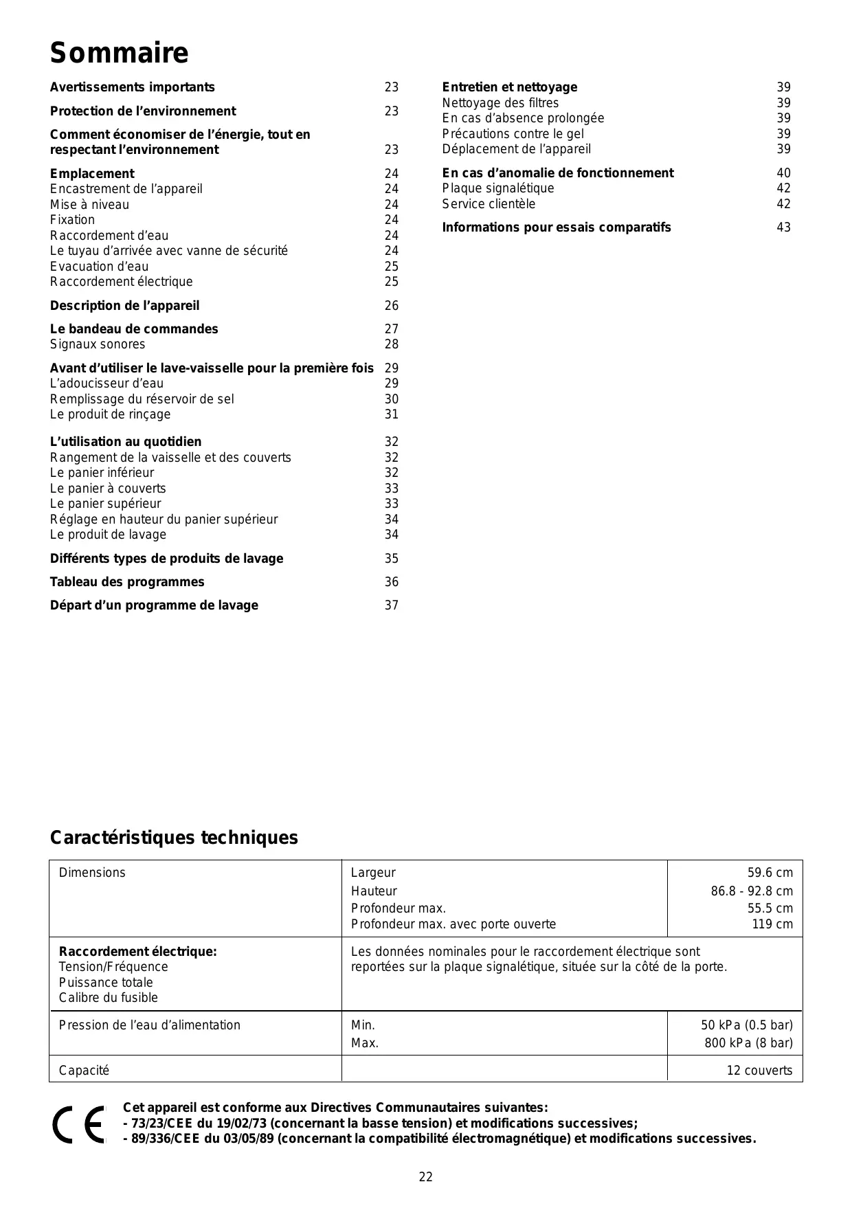 119 cm Raccordement électrique: Tension/Fréquence Puissance totale Calibre du fusible Les données nominales pour le raccordement électrique sont reportées sur la plaque signalétique, située sur la côté de la porte. Pression de l’eau d’alimentation Min. Max. 50 kPa (0.5 bar) 800 kPa (8 bar) Capacité 12 couverts Cet appareil est conforme aux Directives Communautaires suivantes: - 73/23/CEE du 19/02/73 (concernant la basse tension) et modifications successives; - 89/336/CEE du 03/05/89 (concernant la compatibilité électromagnétique) et modifications successives.