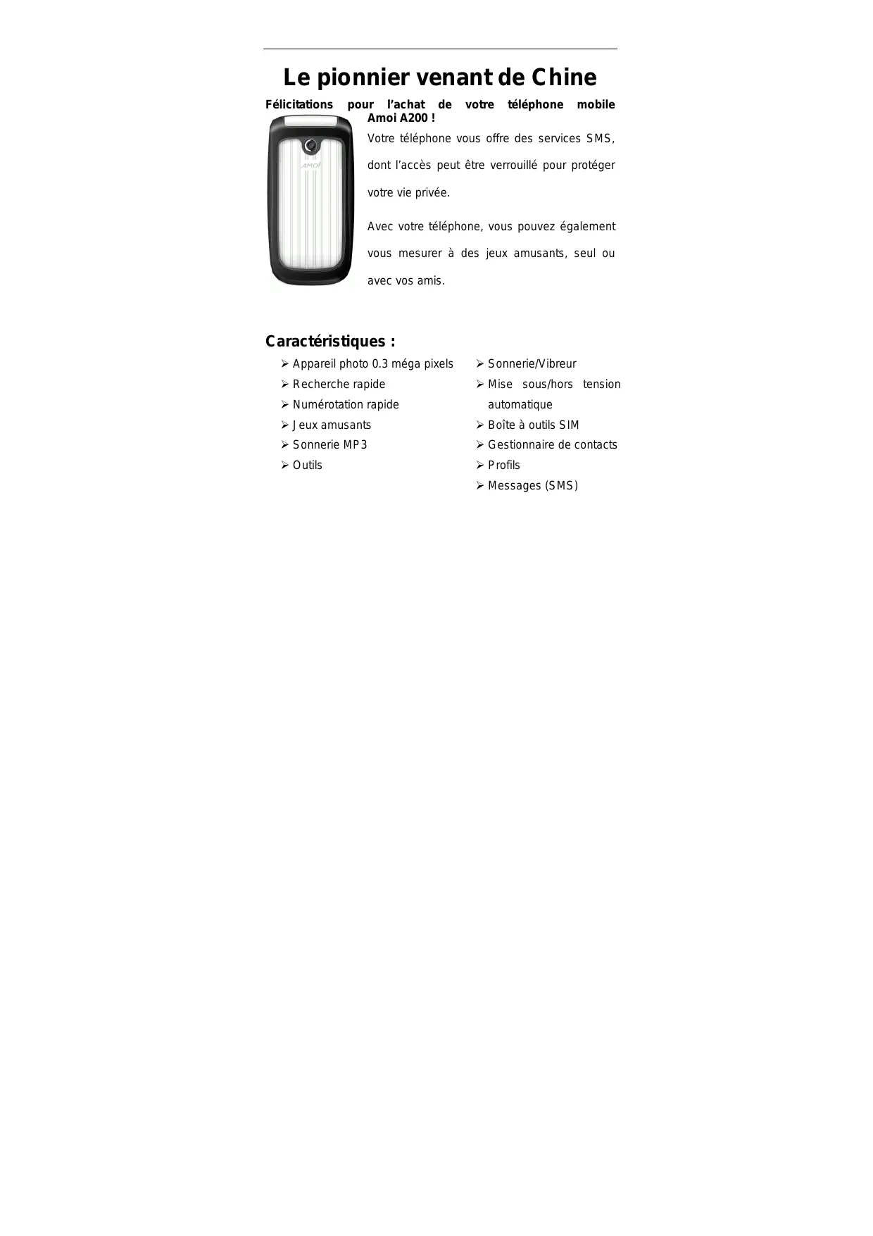 Le pionnier venant de Chine Félicitations pour l’achat de Amoi A200 ! votre téléphone mobile Votre téléphone vous offre des services SMS, dont l’accès peut être verrouillé pour protéger votre vie privée. Avec votre téléphone, vous pouvez également vous mesurer à des jeux amusants, seul ou avec vos amis. Caractéristiques : Appareil photo 0.3 méga pixels Sonnerie/Vibreur Recherche rapide Mise sous/hors tension Numérotation rapide automatique Jeux amusants Boîte à outils SIM Sonnerie MP3 Gestionnaire de contacts Outils Profils Messages (SMS) Déclaration Copyright © 2007 Amoi Electronics Co., Ltd. Tous droits réservés. L’ensemble du contenu du présent document est protégé par un copyright. Toute reproduction, transfert, distribution ou stockage du contenu de ce document, même partiel, sous quelque forme et sans l’autorisation écrite préalable d’Amoi est interdite. 夏新, AMOI et sont des marques et un logo enregistrés de Amoi Electronics Co., Ltd et sont protégés par leurs lois respectives. Les autres noms de produit ou d'entreprise mentionnés dans ce document peuvent être des marques enregistrées détenues par leurs propriétaires respectifs. Amoi a révisé le contenu du présent document mais des erreurs ou des omissions peuvent subsister. Amoi se réserve le droit d'apporter des modifications et des améliorations à tout produit décrit dans le présent document et de réviser ledit document sans préavis. Le présent document constitue un guide utilisateur pour l’usage seul des téléphones portables Amoi et ne fournit aucune explication relative à la configuration matérielle et logicielle des produits décrits dans ledit document. La disponibilité des produits et les améliorations peuvent varier selon les régions. Veuillez contacter le revendeur Amoi le plus proche. Certaines fonctionnalités mentionnées dans le présent document peuvent concerner des services réseau et nécessiter le support de votre opérateur réseau ou de votre fournisseur d’accès. Pour plus de détails, veuillez contacter votre opérateur réseau ou votre fournisseur d’accès. Le présent appareil peut contenir des marchandises, des technologies ou des logiciels assujettis aux lois et règlements sur l’exportation en vigueur en Chine et dans d’autres pays. Tout déroutage contraire à la législation est interdit. Pour des raisons de sécurité, veuillez lire les sections « Pour votre sécurité » et « Consignes de sécurité » du présent document avant d'utiliser l'appareil. Les symboles rencontrés dans le présent document sont définis comme suit : < > représentent les touches programmables ; « » représente les informations relatives à l'affichage sur l'écran du téléphone ;[ ] représente les menus. Contenu Caractéristiques :........................................................................ 1 Déclaration...................................................................................... 2 Pour votre sécurité ..................................................................... 1