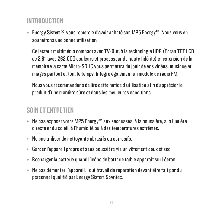 ≥≥ Ne pas exposer votre MP5 Energy™ aux secousses, à la poussière, à la lumière directe et du soleil, à l’humidité ou à des températures extrêmes. ≥≥ Ne pas utiliser de nettoyants abrasifs ou corrosifs. ≥≥ Garder l’appareil propre et sans poussière via un vêtement doux et sec. ≥≥ Recharger la batterie quand l’icône de batterie faible apparaît sur l’écran. ≥≥ Ne pas démonter l’appareil. Tout travail de réparation devant être fait par du personnel qualifié par Energy Sistem Soyntec.