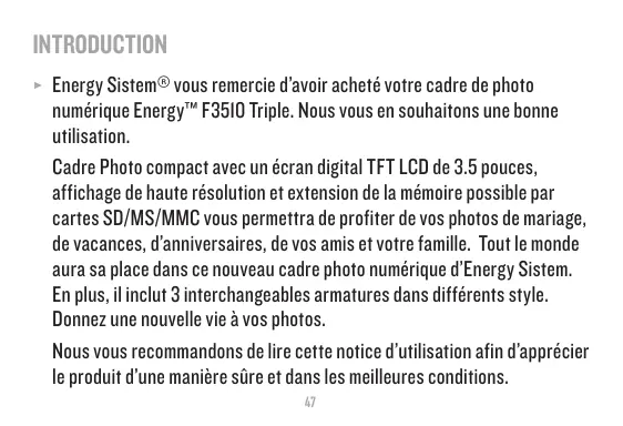 Energy Sistem® vous remercie d'avoir acheté votre cadre de photo numérique Energy™ F35IO Triple. Nous vous en souhaitons une bonne utilisation.