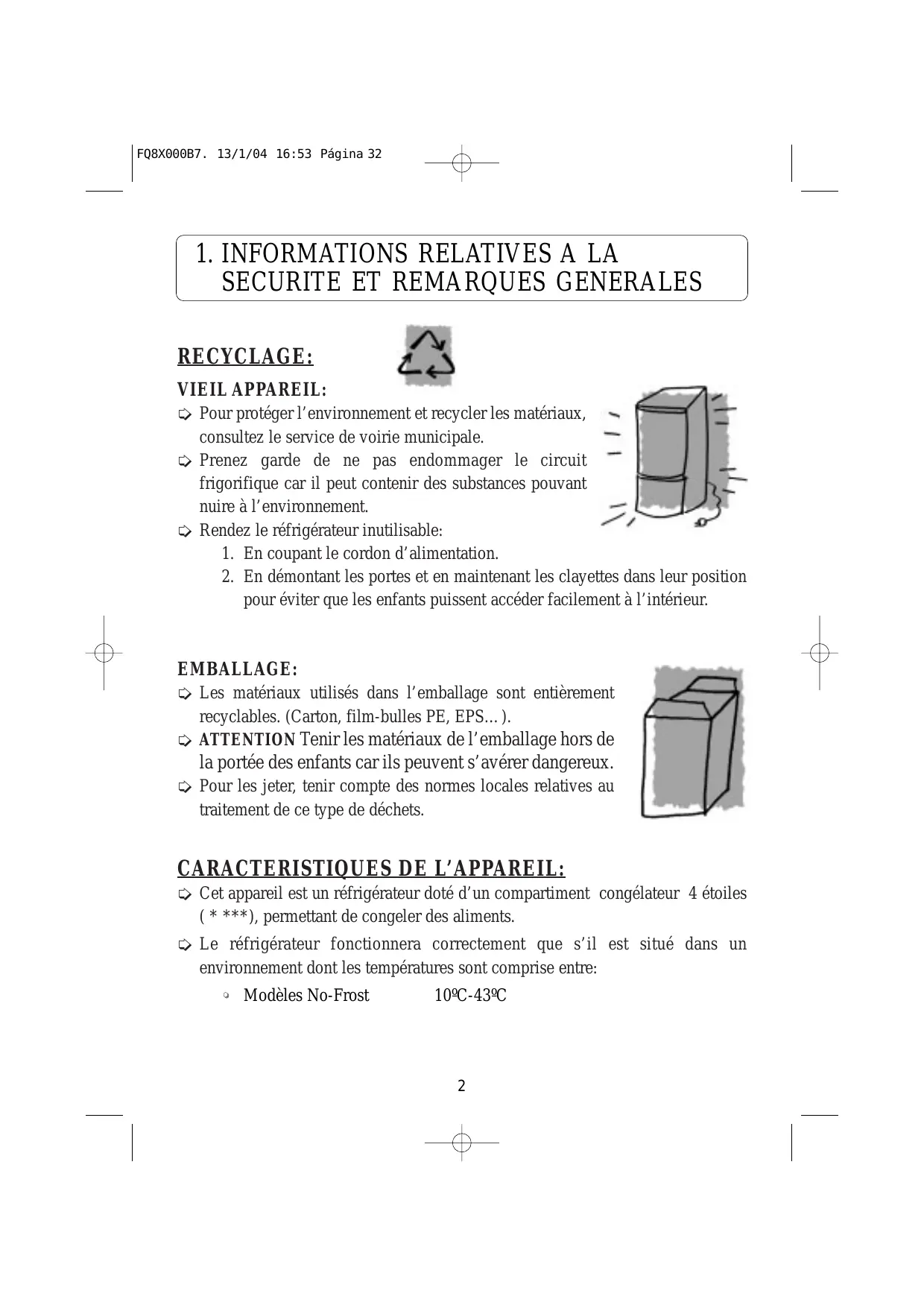 pour éviter que les enfants puissent accéder facilement à l’intérieur. EMBALLAGE: Les matériaux utilisés dans l’emballage sont entièrement recyclables. (Carton, film-bulles PE, EPS…). ATTENTION Tenir les matériaux de l’emballage hors de la portée des enfants car ils peuvent s’avérer dangereux. Pour les jeter, tenir compte des normes locales relatives au traitement de ce type de déchets. CARACTERISTIQUES DE L’APPAREIL: Cet appareil est un réfrigérateur doté d’un compartiment congélateur 4 étoiles ( * ***), permettant de congeler des aliments. Le réfrigérateur fonctionnera correctement que s’il est situé dans un environnement dont les températures sont comprise entre: