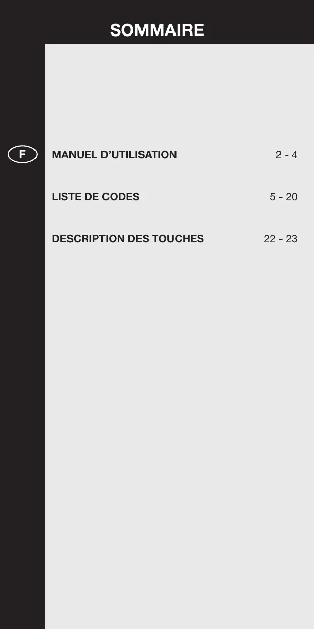 GP et MD / MD et MP où MP et MP pour l'appareil respectif. Les codes des différents appareils pour effectuer une recherche sont: TV®@@@ ®, VCR ® ® ® ®, SAT @ ® @ ®, TNT ® ® ® ®, DVD ® ® © @. Dans l'étape E, utilisez Pour SAT et TNT la touche @: pour magnétoscope et DVD la touche ®. Consultation des codes de réglage Si vous avez réglé la télécommande à l'aide de la fonction recherche ou si vous avez oublié le code, vous pouvez consulter le code momentanément en usage. A. Appuyez sur la touche D sur votre télécommande (pendant environ 4 secondes) jusqu'à ce que le voyant clignote deux fois. B. Saisissez le code © ® ® ® à l'aide des touches numériques. Le voyant clignote deux fois. C. Appuyez sur ® et comptez combien de fois le voyant clignote; c'est le premier chiffre. D. Appuyez sur ® et comptez combien de fois le voyant clignote; c'est le deuxième chiffre. (Pour 0 le voyant ne clignote pas) E. Appuyez sur ® et comptez combien de fois le voyant clignote; c'est le troisième chiffre. (Pour O le voyant ne clignote pas) F._Pressez la touche ® et comptez le nombre de clignotements de la LED. Le résultat correspond au quatrième chiffre du code (si le chiffre est 0, la LED ne clignotera pas). G. Vous pouvez répéter les étapes C, D, E et F autant de fois que nécessaire. Pour consulter les codes momentanément utilisés en magnétoscope, SAT, DVD et TNT, procédez comme pour la consultation pour la TV. Suivez les étapes À à F et utilisez les touches @D / GD et MD / di et MD ou MP et Notez les numéros de code consultés.