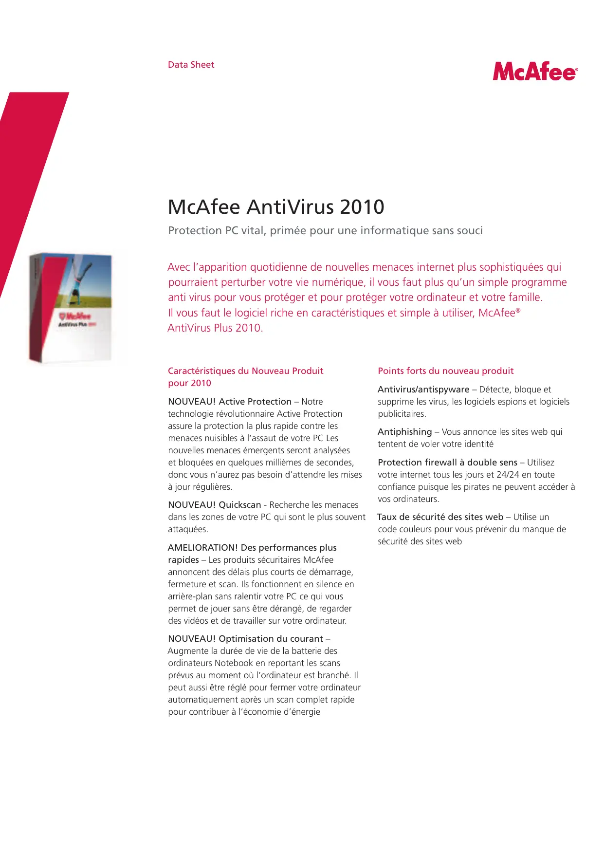 Avec l'apparition quotidienne de nouvelles menaces internet plus sophistiquées qui pourraient perturber votre vie numérique, il vous faut plus qu'un simple programme antivirus pour vous protéger et pour protéger votre ordinateur et votre famille. Il vous faut le logiciel riche en caractéristiques et simple à utiliser, McAfee® AntiVirus Plus 2010.