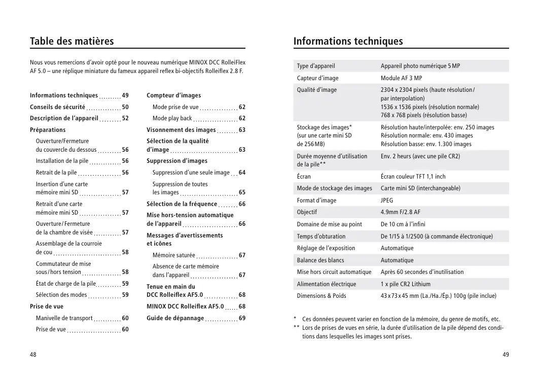 Nous vous remercions d'avoir opté pour le nouveau numérique MINOX DCC RolleiFlex AF 5.0 - une réplique miniature du fameux apparèil reflex bi-objectifs Rolleiflex 2.8 F.