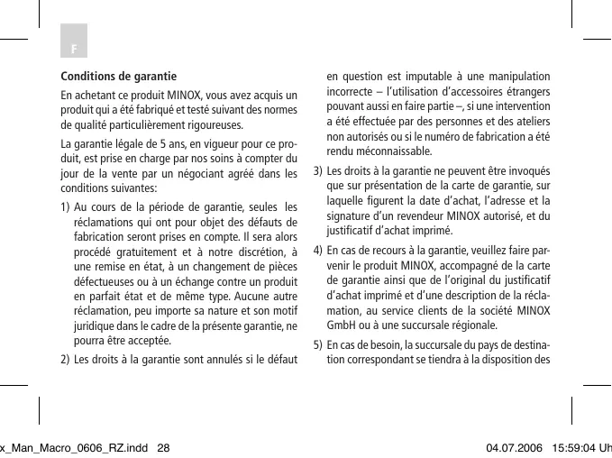 3) Les droits à la garantie ne peuvent être invoqués que sur présentation de la carte de garantie, sur laquelle figurent la date d'achat, l'adresse et la signature d'un revendeur MINOX autorisé, et du justificatif d'achat imprimé. 4) En cas de recours à la garantie, veuillez faire parvenir le produit MINOX, accompagné de la carte de garantie ainsi que de l'original du justificatif d'achat imprimé et d'une description de la réclamation, au service clients de la société MINOX GmbH ou à une succursale régionale. 5) En cas de besoin, la succursale du pays de destination correspondant se tiendra à la disposition des