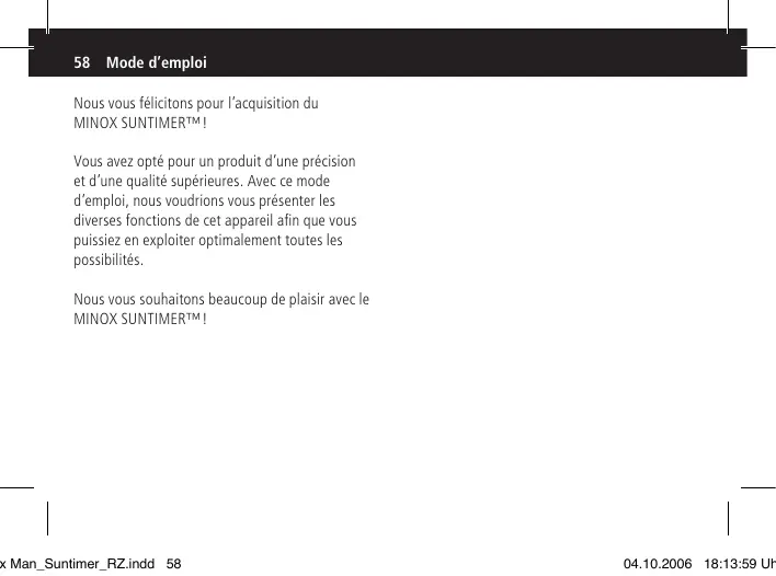 58 Mode d’emploi Nous vous félicitons pour l’acquisition du MINOX SUNTIMER™! Vous avez opté pour un produit d’une précision et d’une qualité supérieures. Avec ce mode d’emploi, nous voudrions vous présenter les diverses fonctions de cet appareil afin que vous puissiez en exploiter optimalement toutes les possibilités. Nous vous souhaitons beaucoup de plaisir avec le MINOX SUNTIMER™! x Man_Suntimer_RZ.indd 58