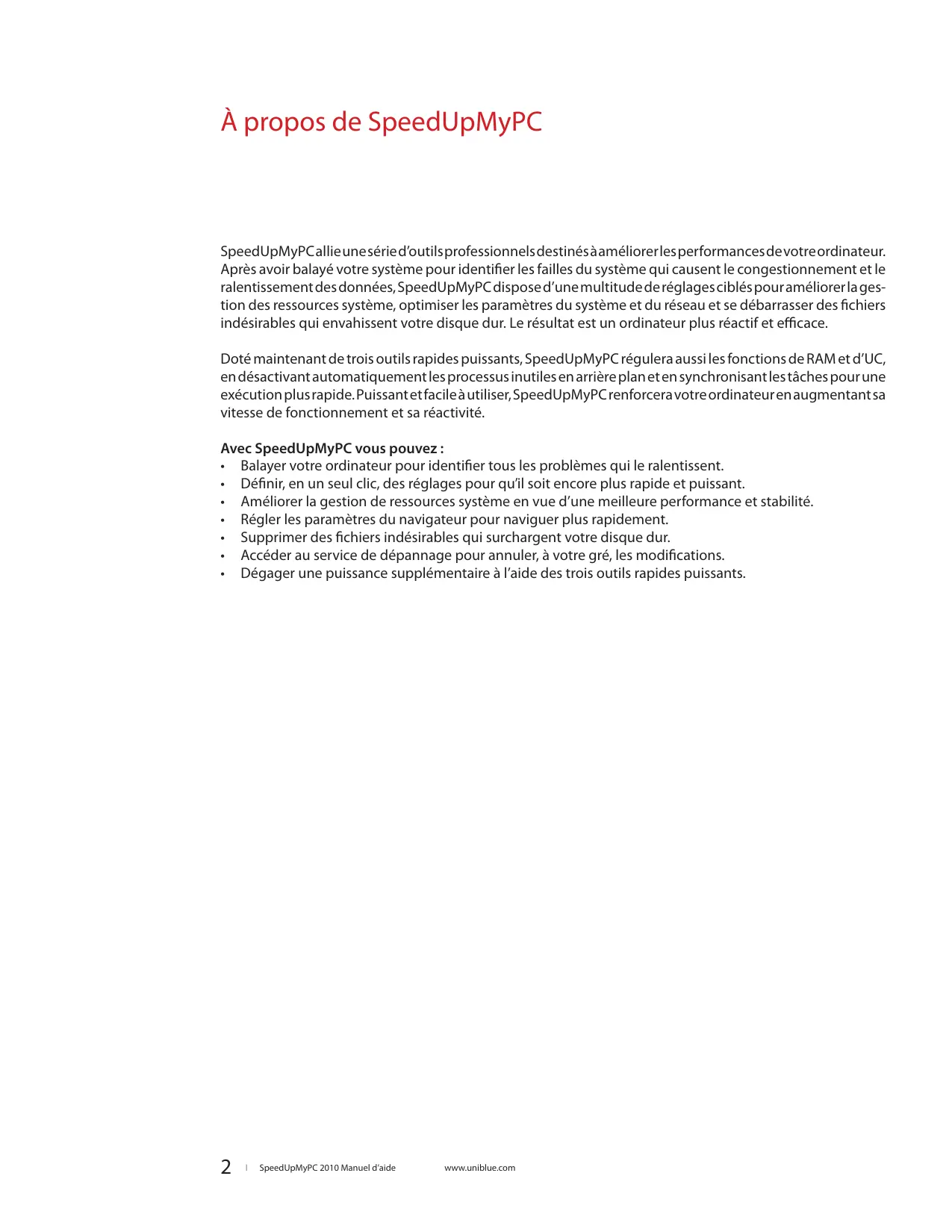 SpeedUpMyPC 2010 Manuel d’aide www.uniblue.com À propos de SpeedUpMyPC SpeedUpMyPC allie une série d’outils professionnels destinés à améliorer les performances de votre ordinateur. Après avoir balayé votre système pour identifier les failles du système qui causent le congestionnement et le ralentissement des données, SpeedUpMyPC dispose d’une multitude de réglages ciblés pour améliorer la gestion des ressources système, optimiser les paramètres du système et du réseau et se débarrasser des fichiers indésirables qui envahissent votre disque dur. Le résultat est un ordinateur plus réactif et efficace. Doté maintenant de trois outils rapides puissants, SpeedUpMyPC régulera aussi les fonctions de RAM et d’UC, en désactivant automatiquement les processus inutiles en arrière plan et en synchronisant les tâches pour une exécution plus rapide. Puissant et facile à utiliser, SpeedUpMyPC renforcera votre ordinateur en augmentant sa vitesse de fonctionnement et sa réactivité. Avec SpeedUpMyPC vous pouvez :