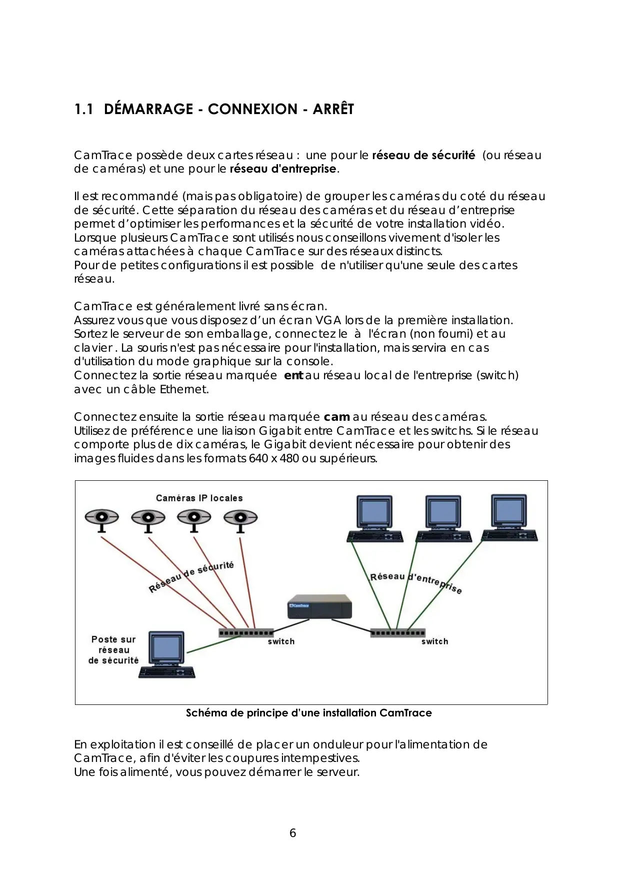 CamTrace possède deux cartes réseau : une pour le réseau de sécurité (ou réseau de caméras) et une pour le réseau d'entreprise. Il est recommandé (mais pas obligatoire) de grouper les caméras du coté du réseau de sécurité. Cette séparation du réseau des caméras et du réseau d’entreprise permet d’optimiser les performances et la sécurité de votre installation vidéo. Lorsque plusieurs CamTrace sont utilisés nous conseillons vivement d'isoler les caméras attachées à chaque CamTrace sur des réseaux distincts. Pour de petites configurations il est possible de n'utiliser qu'une seule des cartes réseau. CamTrace est généralement livré sans écran. Assurez vous que vous disposez d’un écran VGA lors de la première installation. Sortez le serveur de son emballage, connectez le à l'écran (non fourni) et au clavier . La souris n'est pas nécessaire pour l'installation, mais servira en cas d'utilisation du mode graphique sur la console. Connectez la sortie réseau marquée ent au réseau local de l'entreprise (switch) avec un câble Ethernet. Connectez ensuite la sortie réseau marquée cam au réseau des caméras. Utilisez de préférence une liaison Gigabit entre CamTrace et les switchs. Si le réseau comporte plus de dix caméras, le Gigabit devient nécessaire pour obtenir des images fluides dans les formats 640 x 480 ou supérieurs. Schéma de principe d’une installation CamTrace En exploitation il est conseillé de placer un onduleur pour l'alimentation de CamTrace, afin d'éviter les coupures intempestives. Une fois alimenté, vous pouvez démarrer le serveur.