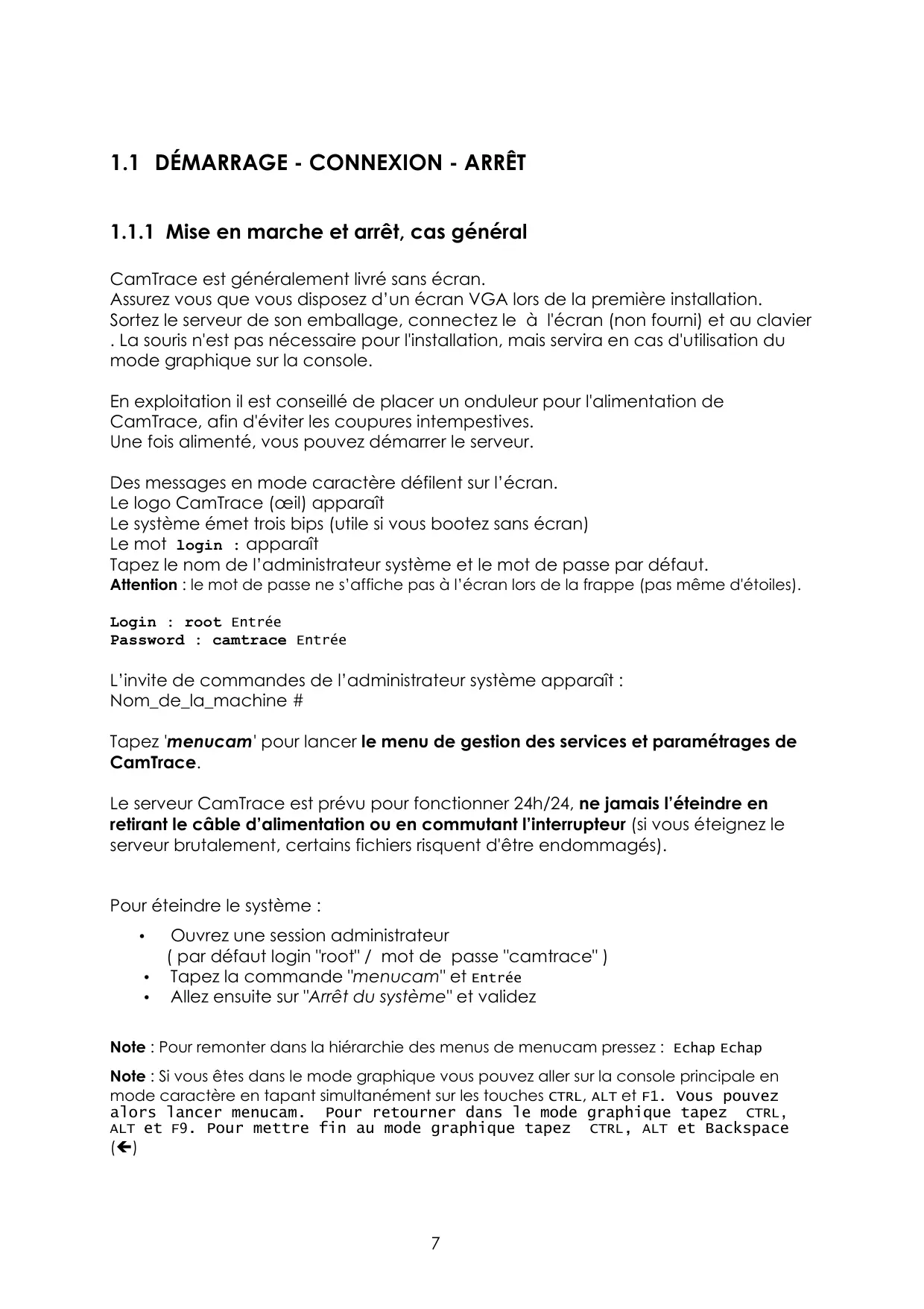 CamTrace est généralement livré sans écran. Assurez vous que vous disposez d’un écran VGA lors de la première installation. Sortez le serveur de son emballage, connectez le à l'écran (non fourni) et au clavier . La souris n'est pas nécessaire pour l'installation, mais servira en cas d'utilisation du mode graphique sur la console. En exploitation il est conseillé de placer un onduleur pour l'alimentation de CamTrace, afin d'éviter les coupures intempestives. Une fois alimenté, vous pouvez démarrer le serveur. Des messages en mode caractère défilent sur l’écran. Le logo CamTrace (œil) apparaît Le système émet trois bips (utile si vous bootez sans écran) Le mot login : apparaît Tapez le nom de l’administrateur système et le mot de passe par défaut. Attention : le mot de passe ne s’affiche pas à l’écran lors de la frappe (pas même d'étoiles). Login : root Entrée Password : camtrace Entrée L’invite de commandes de l’administrateur système apparaît : Nom_de_la_machine # Tapez 'menucam' pour lancer le menu de gestion des services et paramétrages de CamTrace. Le serveur CamTrace est prévu pour fonctionner 24h/24, ne jamais l’éteindre en retirant le câble d’alimentation ou en commutant l’interrupteur (si vous éteignez le serveur brutalement, certains fichiers risquent d'être endommagés). Pour éteindre le système :