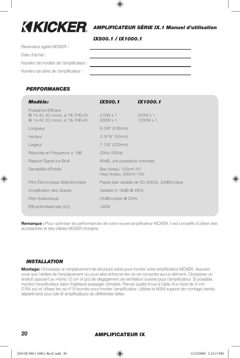 Remarque : Pour optimiser les performances de votre nouvel amplificateur KICKER, il est conseillé d'utiliser des accessoires et des câbles KICKER d'origine.