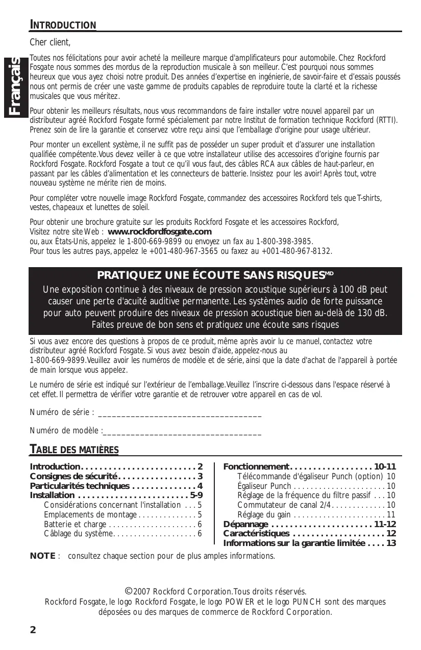 Bienvenue chez Rockford Fosgate ! Ce manuel vise à informer le propriétaire, le vendeur et l'installateur de l'appareil. Si vous désirez apprendre rapidement comment installer ce produit, consultez la section Installation du manuel. Reportez-vous à la Table des matières pour d'autres informations. Nous nous efforçons de faire en sorte que toutes les informations contenues dans ce manuel soient à jour. Mais comme nous améliorons constamment nos produits, nous nous réservons le droit de modifier ces informations sans préavis.