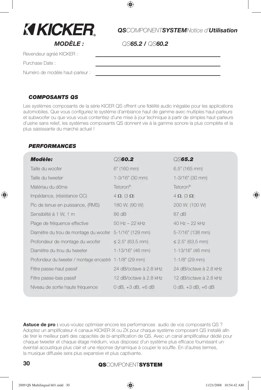 Astuce de pro : vous voulez optimiser encore les performances audio de vos composants QS ? Adoptez un amplificateur 4 canaux KICKER IX ou ZX pour chaque système composant QS installé afin de tirer le meilleur parti des capacités de bi-amplification de QS. Avec un canal amplificateur dédié pour chaque tweeter et chaque étage médium, vous disposez d'un système plus efficace fournissant un éventail acoustique plus clair et une réponse dynamique à couper le souffle. En d'autres termes, la musique diffusée sera plus expansive et plus captivante.