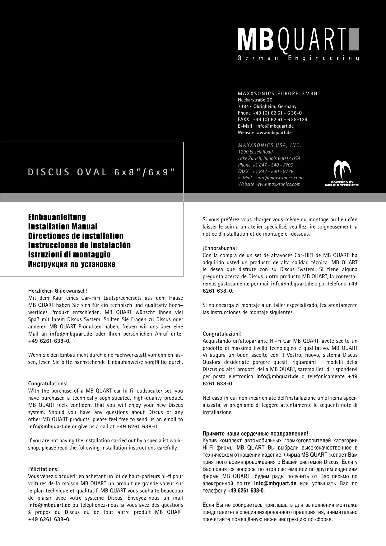 Vous venez d'acquérir en achetant un lot de haut-parleurs hi-fi pour voitures de la maison MB QUART un produit de grande valeur sur le plan technique et qualitatif. MB QUART vous souhaite beaucoup de plaisir avec votre système Discus. Envoyez-nous un mail info@mbquart.de ou téléphonez-nous si vous avez des questions à propos du Discus ou de tout autre produit MB QUART +49 6261 638-0.