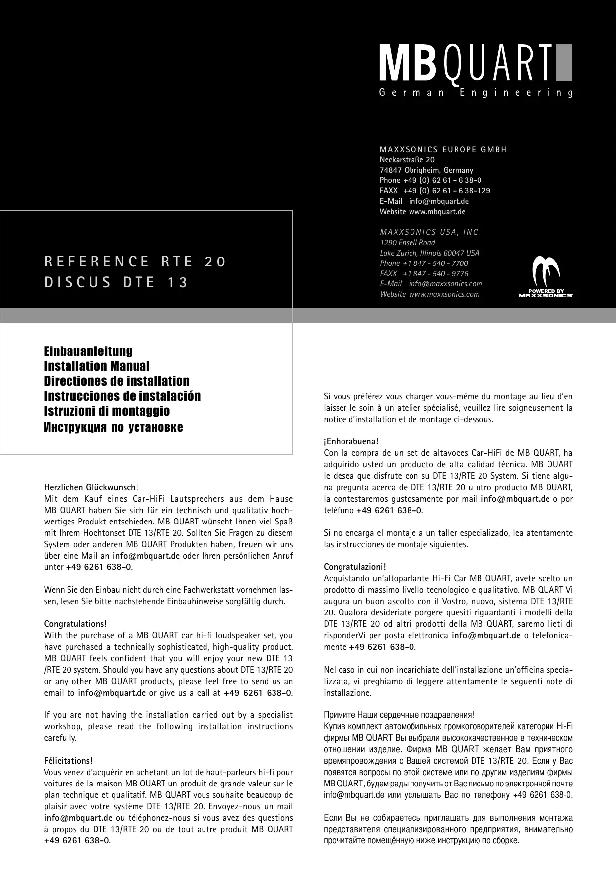 Vous venez d'acquérir en achetant un lot de haut-parleurs hi-fi pour voitures de la maison MB QUART un produit de grande valeur sur le plan technique et qualitatif. MB QUART vous souhaite beaucoup de avec tout système DTE 13/RTE 20. Envoyez-nous un mail info@mbquart.de ou téléphonez-nous si vous avez des questions à propos du DTE 13/RTE 20 ou de tout autre produit MB QUART +49 6261 638-0.