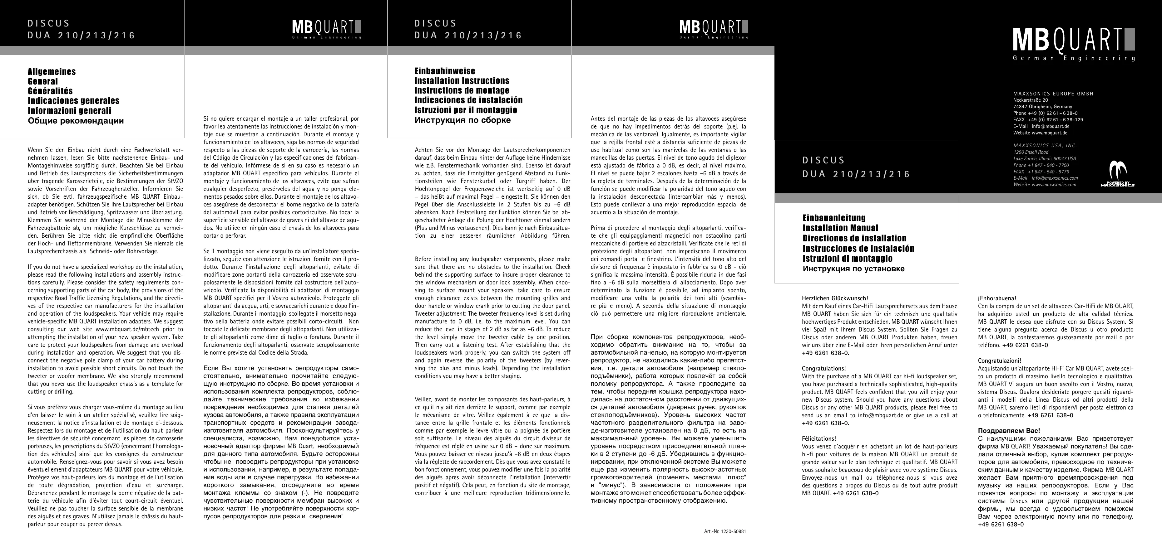 Vous venez d'acquérir en achetant un lot de haut-parleurs hi-fi pour voitures de la maison MB QUART un produit de grande valeur sur le plan technique et qualitatif. MB QUART vous souhaite beaucoup de plaisir avec votre système Discus. Envoyez-nous un mail ou téléphonez-nous si vous avez des questions à propos du Discus ou de tout autre produit MB QUART. +49 6261 638-0