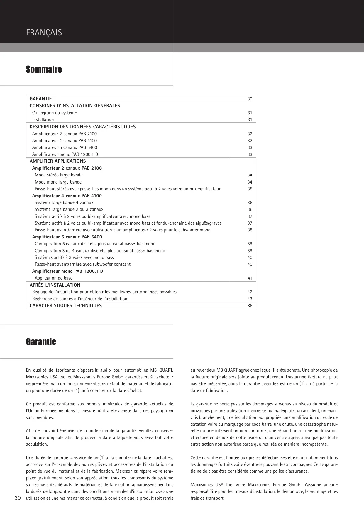 En qualité de fabricants d'appareils audio pour automobiles MB QUART, Maxxsonics USA Inc. et Maxxsonics Europe GmbH garantissent à l'acheteur de première main un fonctionnement sans défaut de matériel et de fabrication pour une durée de un (1) an à compter de la date d'achat.