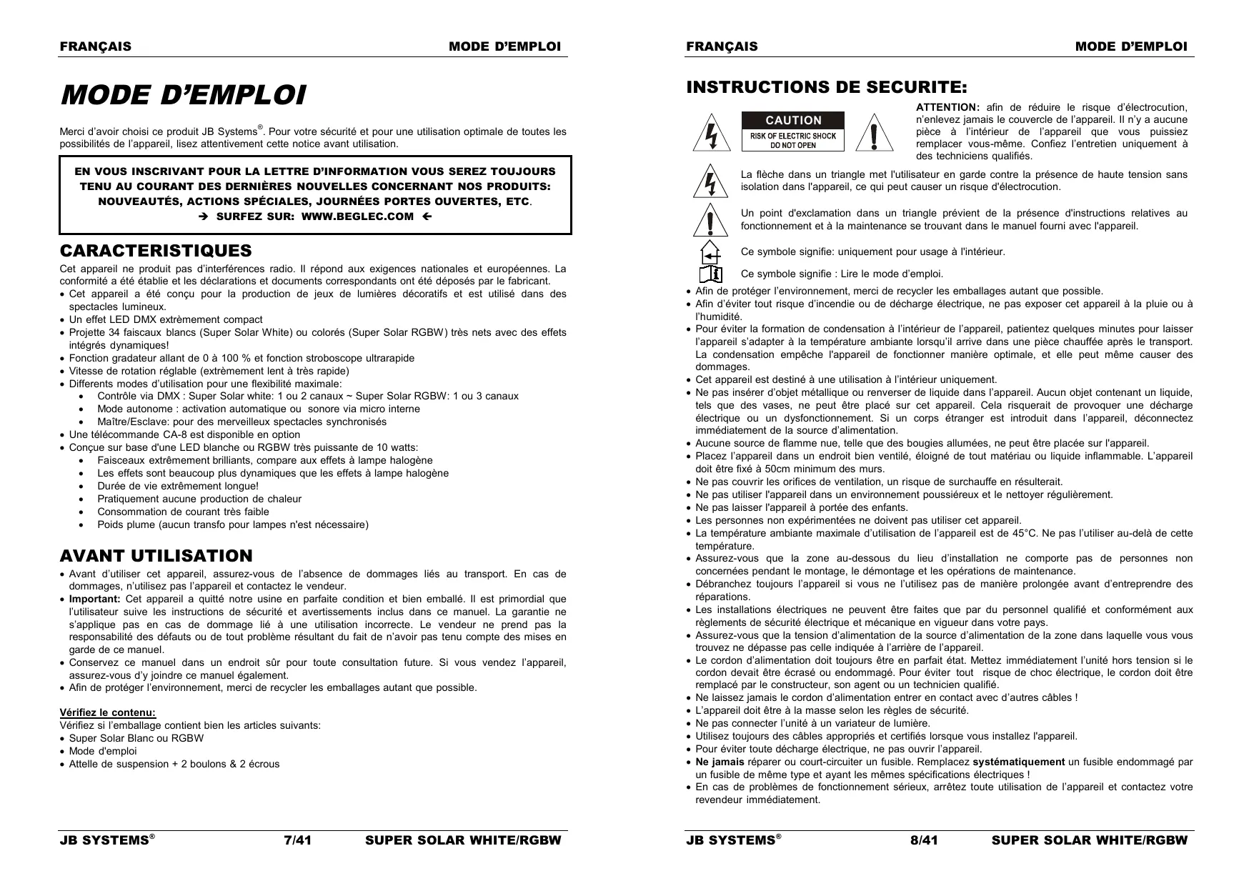 Merci d'avoir besoin si produit JB Systems. Pour votre sécurité et pour une utilisation optimale de toutes les possibilités de l'appareil, lisez attentivement cette notice avant utilisation.