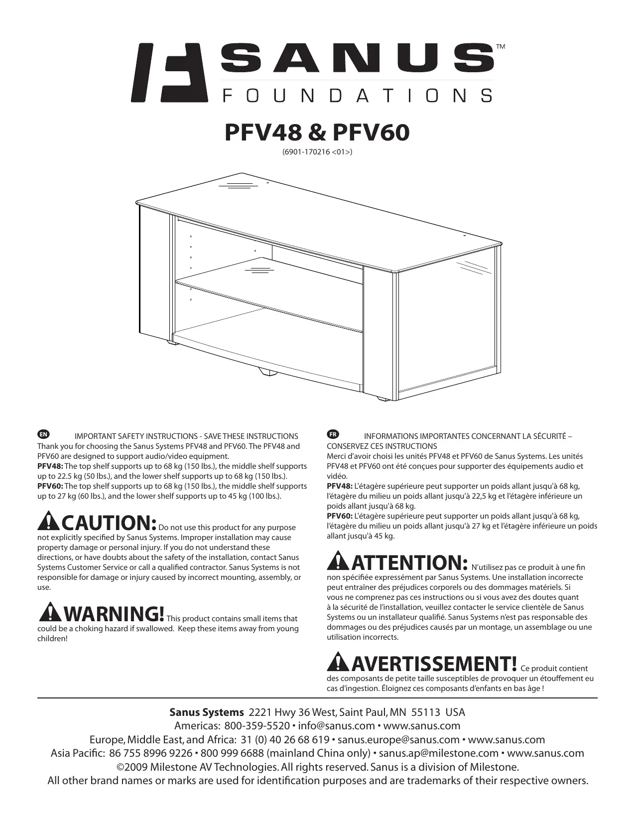 Merci d'avoir choisi les unités PFV48 et PFV60 de Sanus Systems. Les unités PFV48 et PFV60 ont été conçues pour supporter des équipements audio et vidéo. PFV48: L'étagère supérieure peut supporter un poids allant jusqu'à 68 kg, l'étagère du milieu un poids allant jusqu'à 22,5 kg et l'étagère inférieure un poids allant jusqu'à 68 kg. PFV60: L'étagère supérieure peut supporter un poids allant jusqu'à 68 kg, l'étagère du milieu un poids allant jusqu'à 27 kg et l'étagère inférieure un poids allant jusqu'à 45 kg. À ATTENTION: vice pas ce produ une non spécifiée expressément par Sanus Systems. Une installation incorrecte peut entraîner des préjudices corporels ou des dommages matériels. Si vous ne comprenez pas ces instructions ou si vous avez des doutes quant à la sécurité de l'installation, veuillez contacter le service clientèle de Sanus Systems ou un installateur qualifié. Sanus Systems n'est pas responsable des dommages ou des préjudices causés par un montage, un assemblage ou une utilisation incorrects. À AVERTISSEMENT! one des composants de petite taille susceptibles de provoquer un étouffement eu cas d'ingestion. Éloignez ces composants d'enfants en bas âge ! Sanus Systems 2221 Hwy 36 West, Saint Paul, MN 55113 USA Americas: 800-359-5520 - info@sanus.com + www.sanus.com Europe, Middle East, and Africa: 31 (0) 40 26 68 619 : sanus.europe@sanus.com - www.sanus.com Asia Pacific: 86 755 8996 9226 + 800 999 6688 (mainland China only) + sanus.ap@milestone.com + www.sanus.com ©2009 Milestone AV Technologies. All rights reserved. Sanus is a division of Milestone. All other brand names or marks are used for identification purposes and are trademarks of their respective owners.