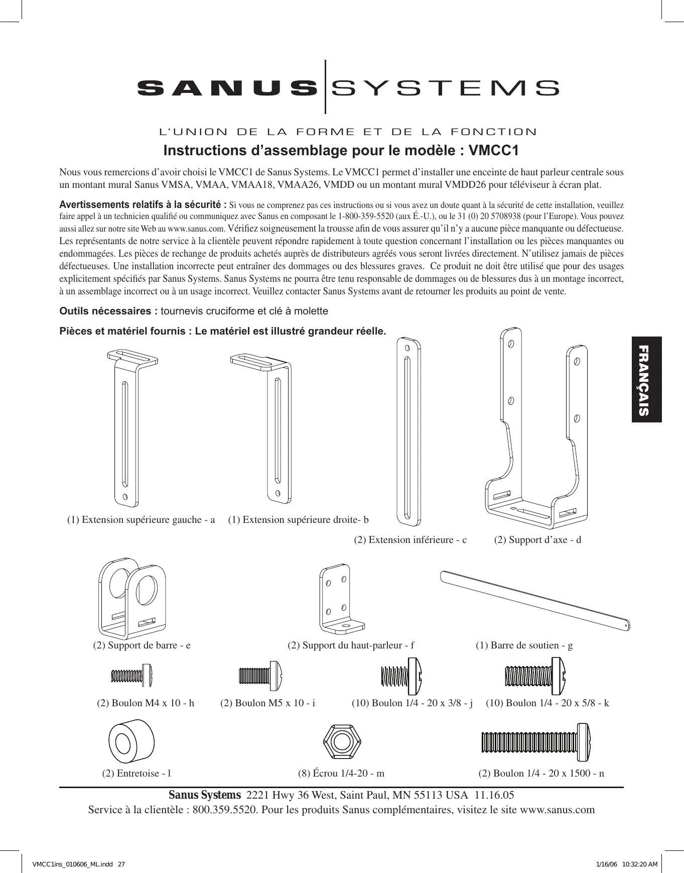 FONCTION Instructions d’assemblage pour le modèle : VMCC1 Nous vous remercions d’avoir choisi le VMCC1 de Sanus Systems. Le VMCC1 permet d’installer une enceinte de haut parleur centrale sous un montant mural Sanus VMSA, VMAA, VMAA18, VMAA26, VMDD ou un montant mural VMDD26 pour téléviseur à écran plat. Avertissements relatifs à la sécurité : Si vous ne comprenez pas ces instructions ou si vous avez un doute quant à la sécurité de cette installation, veuillez faire appel à un technicien qualifié ou communiquez avec Sanus en composant le 1-800-359-5520 (aux É.-U.), ou le 31 (0) 20 5708938 (pour l’Europe). Vous pouvez aussi allez sur notre site Web au www.sanus.com. Vérifiez soigneusement la trousse afin de vous assurer qu’il n’y a aucune pièce manquante ou défectueuse. Les représentants de notre service à la clientèle peuvent répondre rapidement à toute question concernant l’installation ou les pièces manquantes ou endommagées. Les pièces de rechange de produits achetés auprès de distributeurs agréés vous seront livrées directement. N’utilisez jamais de pièces défectueuses. Une installation incorrecte peut entraîner des dommages ou des blessures graves. Ce produit ne doit être utilisé que pour des usages explicitement spécifiés par Sanus Systems. Sanus Systems ne pourra être tenu responsable de dommages ou de blessures dus à un montage incorrect, à un assemblage incorrect ou à un usage incorrect. Veuillez contacter Sanus Systems avant de retourner les produits au point de vente. Outils nécessaires : tournevis cruciforme et clé à molette Pièces et matériel fournis : Le matériel est illustré grandeur réelle. FRANÇAIS (1) Extension supérieure gauche - a (1) Extension supérieure droite- b
