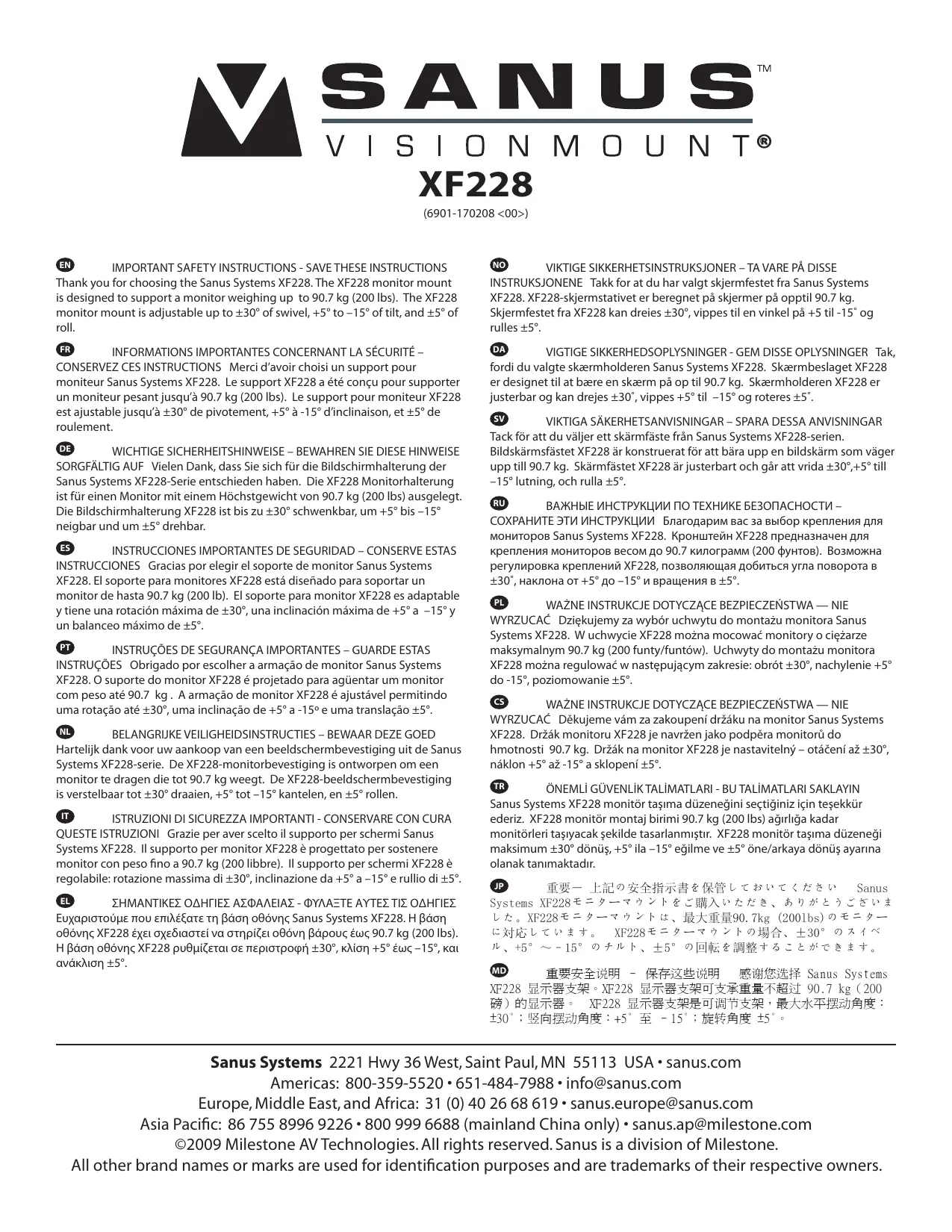 Téléchargez la notice de votre Support TV au format PDF gratuitement ! Retrouvez votre notice XF228 - SANUS et reprennez votre appareil électronique en main. Sur cette page sont publiés tous les documents nécessaires à l'utilisation de votre appareil XF228 de la marque SANUS.