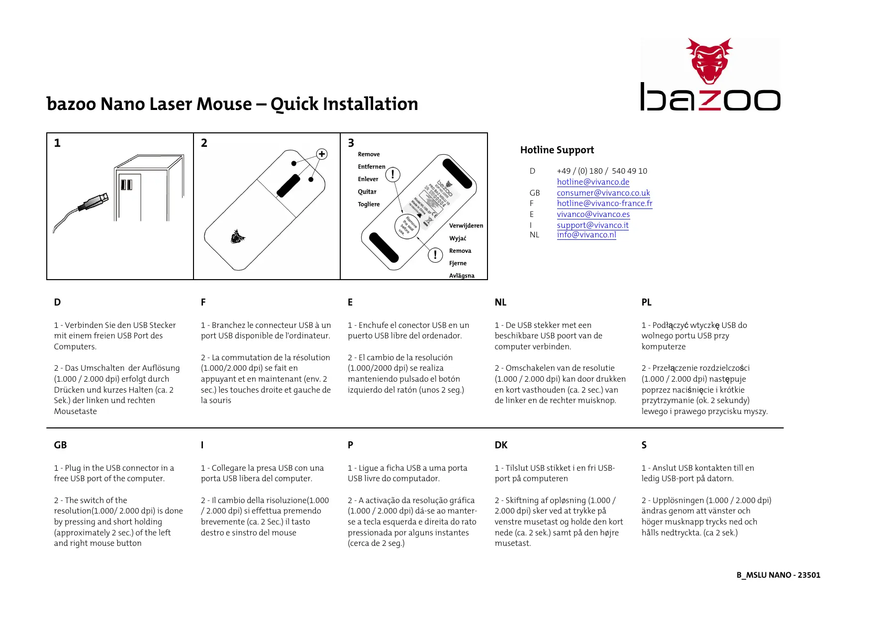 1 - Branchez le connecteur USB à un port USB disponible de l'ordinateur. 2 - La commutation de la résolution (1.000/2.000 dpi) se fait en appuyant et en maintenant (env. 2 sec.) les touches droite et gauche de la souris.