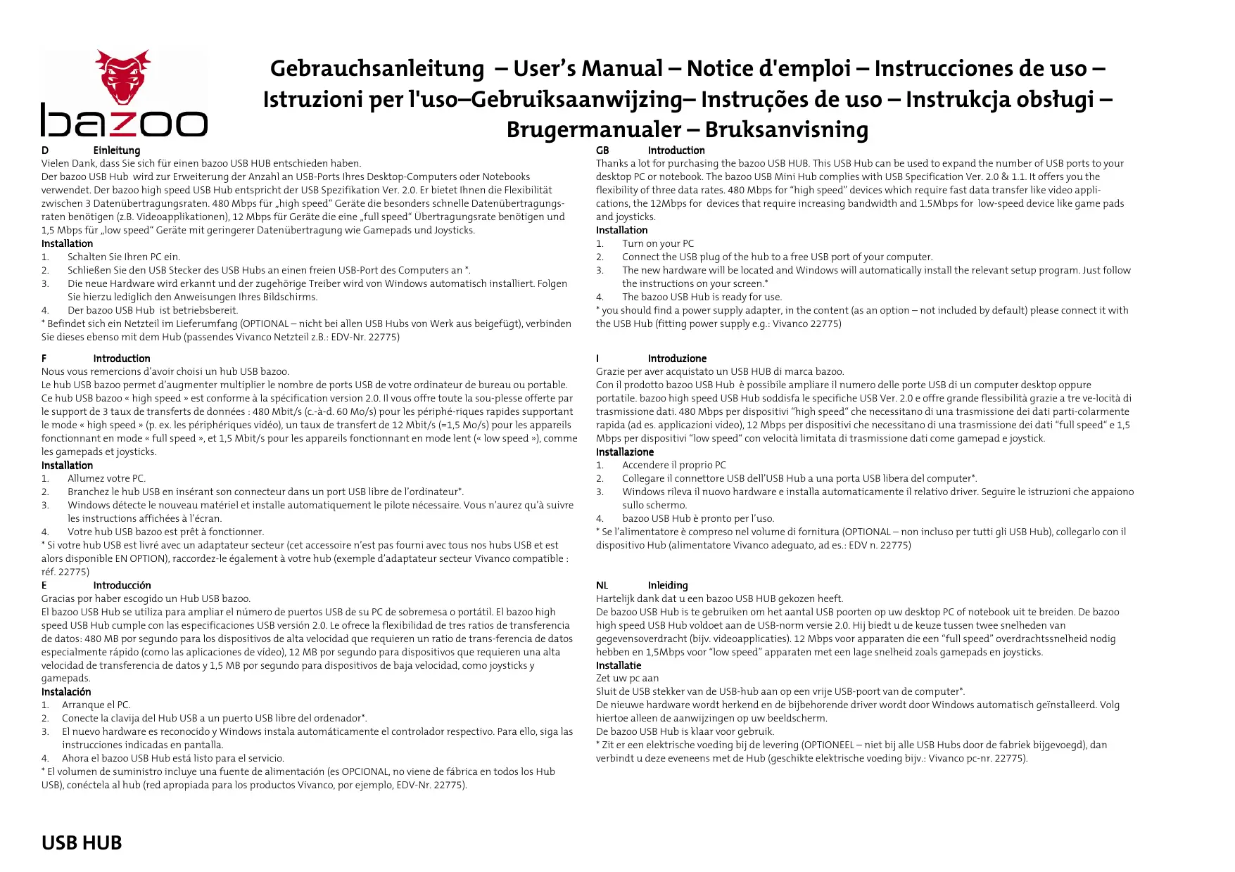 Le hub USB bazoo permet d'augmenter le nombre de ports USB de votre ordinateur de bureau ou portable. Ce hub USB bazoo « high speed » est conforme à la Specification version 2.0. Il vous offre toute la soupèce offerte par le support de 3 taux de transferts de données : 480 Mbit/s (c.-à-d. 60 Mo/s) pour les périphériques rapides supporting le mode « high speed » (p. ex. les périphériques video), un taux de transfert de 12 Mbit/s (=1,5 Mo/s) pour les appareils fonctionnant en mode « full speed », et 1,5 Mbit/s pour les appareils fonctionnant en mode lent (« low speed »), comme les gamepads et joysticks.