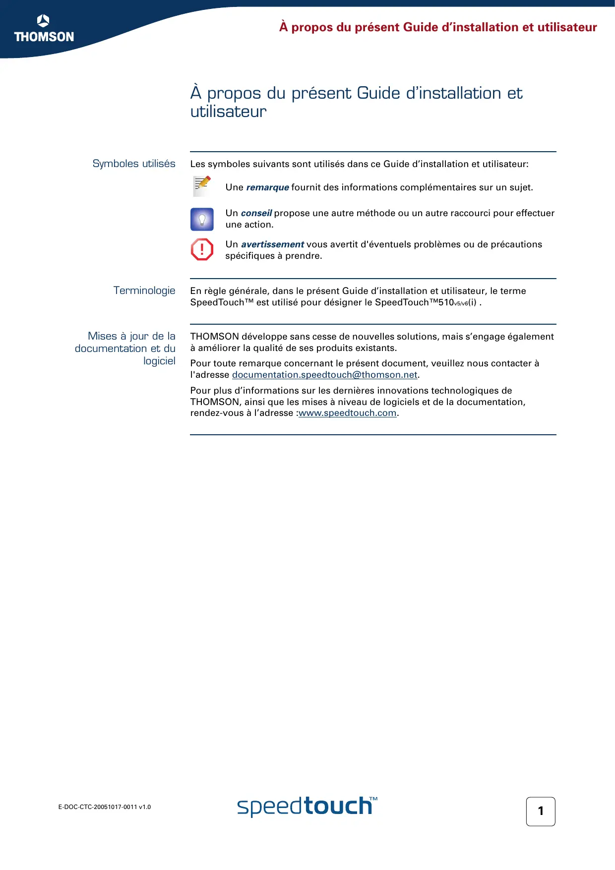 Terminologie Mises à jour de la documentation et du logiciel Un avertissement vous avertit d'éventuels problèmes ou de précautions spécifiques à prendre. En règle générale, dans le présent Guide d’installation et utilisateur, le terme SpeedTouch™ est utilisé pour désigner le SpeedTouch™510v5/v6(i) . THOMSON développe sans cesse de nouvelles solutions, mais s’engage également à améliorer la qualité de ses produits existants. Pour toute remarque concernant le présent document, veuillez nous contacter à l'adresse documentation.speedtouch@thomson.net. Pour plus d’informations sur les dernières innovations technologiques de THOMSON, ainsi que les mises à niveau de logiciels et de la documentation, rendez-vous à l’adresse :www.speedtouch.com. E-DOC-CTC-20051017-0011 v1.0