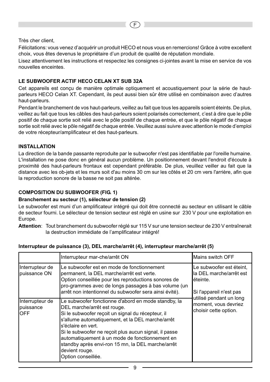 | Interrupteur de puissance OFF | Le subwoofer fonctionne d'abord en mode standby, la DEL marche/arrêt est rouge. Si le subwoofer recoit un signal du récepteur, il s'allume automatiquement, et la DEL marche/arrêt s'éclaire en vert. Si le subwoofer ne recoit plusaucun signal, il passé automatiquement à un mode de fonctionnement en standby après environ-ron 15 mn, la DEL marche/arrêt devient rouge. Option conseillée. |