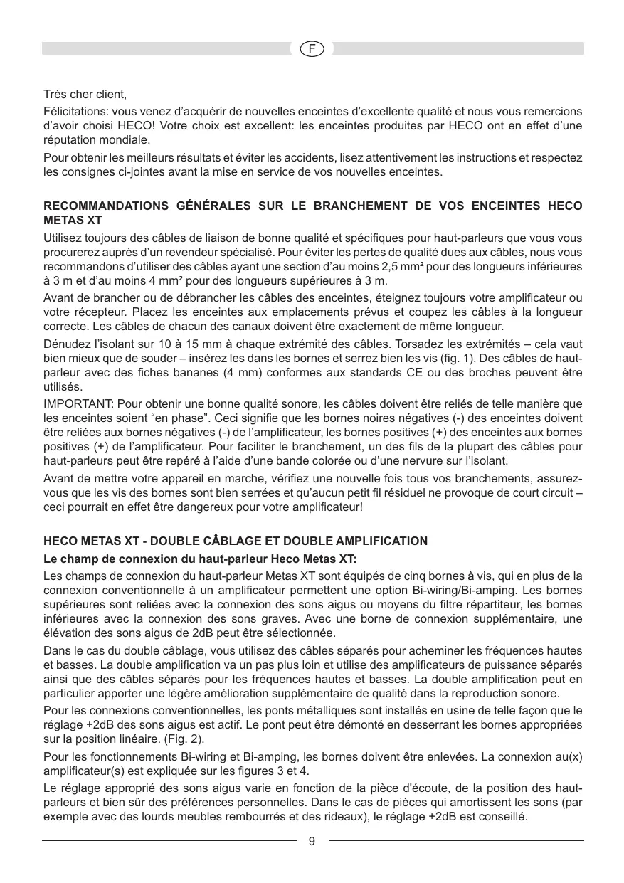 Très cher client, Félicitations: vous venez d’acquérir de nouvelles enceintes d’excellente qualité et nous vous remercions d’avoir choisi HECO! Votre choix est excellent: les enceintes produites par HECO ont en effet d’une réputation mondiale. Pour obtenir les meilleurs résultats et éviter les accidents, lisez attentivement les instructions et respectez les consignes ci-jointes avant la mise en service de vos nouvelles enceintes. RECOMMANDATIONS GÉNÉRALES SUR LE BRANCHEMENT DE VOS ENCEINTES HECO METAS XT Utilisez toujours des câbles de liaison de bonne qualité et spécifiques pour haut-parleurs que vous vous procurerez auprès d’un revendeur spécialisé. Pour éviter les pertes de qualité dues aux câbles, nous vous recommandons d’utiliser des câbles ayant une section d’au moins 2,5 mm² pour des longueurs inférieures à 3 m et d’au moins 4 mm² pour des longueurs supérieures à 3 m. Avant de brancher ou de débrancher les câbles des enceintes, éteignez toujours votre amplificateur ou votre récepteur. Placez les enceintes aux emplacements prévus et coupez les câbles à la longueur correcte. Les câbles de chacun des canaux doivent être exactement de même longueur. Dénudez l’isolant sur 10 à 15 mm à chaque extrémité des câbles. Torsadez les extrémités – cela vaut bien mieux que de souder – insérez les dans les bornes et serrez bien les vis (fig. 1). Des câbles de hautparleur avec des fiches bananes (4 mm) conformes aux standards CE ou des broches peuvent être utilisés. IMPORTANT: Pour obtenir une bonne qualité sonore, les câbles doivent être reliés de telle manière que les enceintes soient “en phase”. Ceci signifie que les bornes noires négatives (-) des enceintes doivent être reliées aux bornes négatives (-) de l’amplificateur, les bornes positives (+) des enceintes aux bornes positives (+) de l’amplificateur. Pour faciliter le branchement, un des fils de la plupart des câbles pour haut-parleurs peut être repéré à l’aide d’une bande colorée ou d’une nervure sur l’isolant. Avant de mettre votre appareil en marche, vérifiez une nouvelle fois tous vos branchements, assurezvous que les vis des bornes sont bien serrées et qu’aucun petit fil résiduel ne provoque de court circuit – ceci pourrait en effet être dangereux pour votre amplificateur! HECO METAS XT - DOUBLE CÂBLAGE ET DOUBLE AMPLIFICATION Le champ de connexion du haut-parleur Heco Metas XT: Les champs de connexion du haut-parleur Metas XT sont équipés de cinq bornes à vis, qui en plus de la connexion conventionnelle à un amplificateur permettent une option Bi-wiring/Bi-amping. Les bornes supérieures sont reliées avec la connexion des sons aigus ou moyens du filtre répartiteur, les bornes inférieures avec la connexion des sons graves. Avec une borne de connexion supplémentaire, une élévation des sons aigus de 2dB peut être sélectionnée. Dans le cas du double câblage, vous utilisez des câbles séparés pour acheminer les fréquences hautes et basses. La double amplification va un pas plus loin et utilise des amplificateurs de puissance séparés ainsi que des câbles séparés pour les fréquences hautes et basses. La double amplification peut en particulier apporter une légère amélioration supplémentaire de qualité dans la reproduction sonore. Pour les connexions conventionnelles, les ponts métalliques sont installés en usine de telle façon que le réglage +2dB des sons aigus est actif. Le pont peut être démonté en desserrant les bornes appropriées sur la position linéaire. (Fig. 2). Pour les fonctionnements Bi-wiring et Bi-amping, les bornes doivent être enlevées. La connexion au(x) amplificateur(s) est expliquée sur les figures 3 et 4. Le réglage approprié des sons aigus varie en fonction de la pièce d'écoute, de la position des hautparleurs et bien sûr des préférences personnelles. Dans le cas de pièces qui amortissent les sons (par exemple avec des lourds meubles rembourrés et des rideaux), le réglage +2dB est conseillé.
