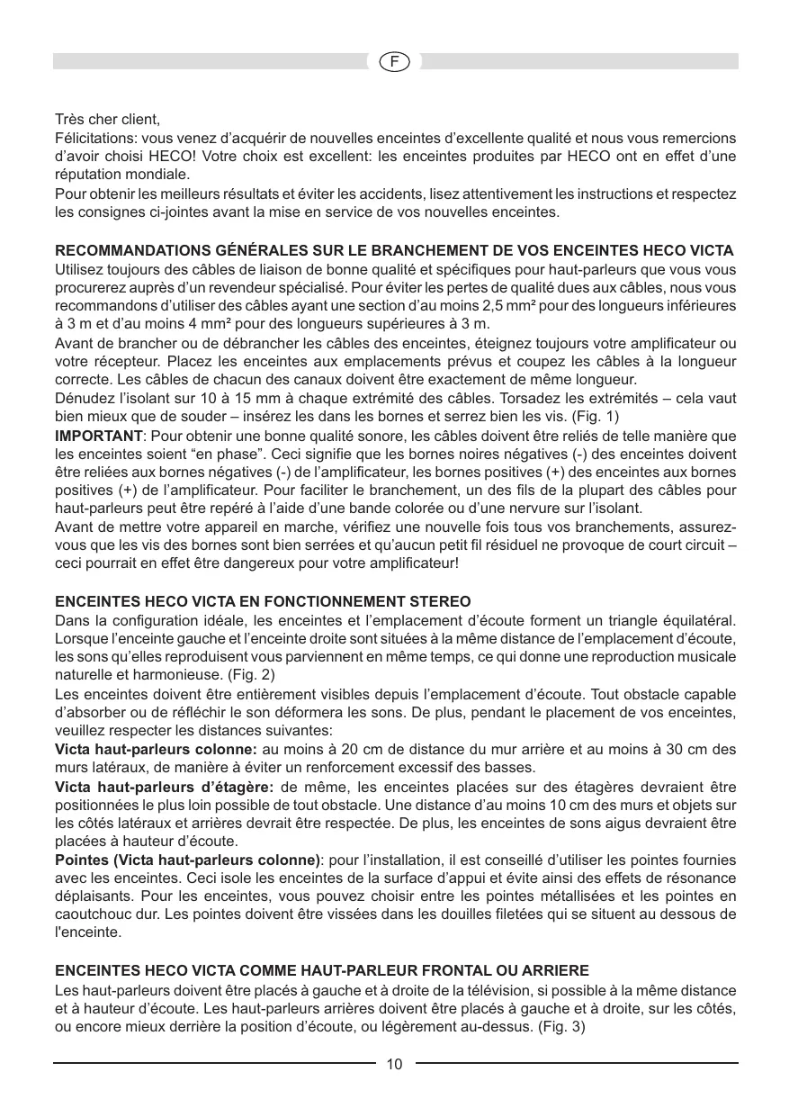 Très cher client, Félicitations: vous venez d’acquérir de nouvelles enceintes d’excellente qualité et nous vous remercions d’avoir choisi HECO! Votre choix est excellent: les enceintes produites par HECO ont en effet d’une réputation mondiale. Pour obtenir les meilleurs résultats et éviter les accidents, lisez attentivement les instructions et respectez les consignes ci-jointes avant la mise en service de vos nouvelles enceintes. RECOMMANDATIONS GÉNÉRALES SUR LE BRANCHEMENT DE VOS ENCEINTES HECO VICTA Utilisez toujours des câbles de liaison de bonne qualité et spécifiques pour haut-parleurs que vous vous procurerez auprès d’un revendeur spécialisé. Pour éviter les pertes de qualité dues aux câbles, nous vous recommandons d’utiliser des câbles ayant une section d’au moins 2,5 mm² pour des longueurs inférieures à 3 m et d’au moins 4 mm² pour des longueurs supérieures à 3 m. Avant de brancher ou de débrancher les câbles des enceintes, éteignez toujours votre amplificateur ou votre récepteur. Placez les enceintes aux emplacements prévus et coupez les câbles à la longueur correcte. Les câbles de chacun des canaux doivent être exactement de même longueur. Dénudez l’isolant sur 10 à 15 mm à chaque extrémité des câbles. Torsadez les extrémités – cela vaut bien mieux que de souder – insérez les dans les bornes et serrez bien les vis. (Fig. 1) IMPORTANT: Pour obtenir une bonne qualité sonore, les câbles doivent être reliés de telle manière que les enceintes soient “en phase”. Ceci signifie que les bornes noires négatives (-) des enceintes doivent être reliées aux bornes négatives (-) de l’amplificateur, les bornes positives (+) des enceintes aux bornes positives (+) de l’amplificateur. Pour faciliter le branchement, un des fils de la plupart des câbles pour haut-parleurs peut être repéré à l’aide d’une bande colorée ou d’une nervure sur l’isolant. Avant de mettre votre appareil en marche, vérifiez une nouvelle fois tous vos branchements, assurezvous que les vis des bornes sont bien serrées et qu’aucun petit fil résiduel ne provoque de court circuit – ceci pourrait en effet être dangereux pour votre amplificateur!