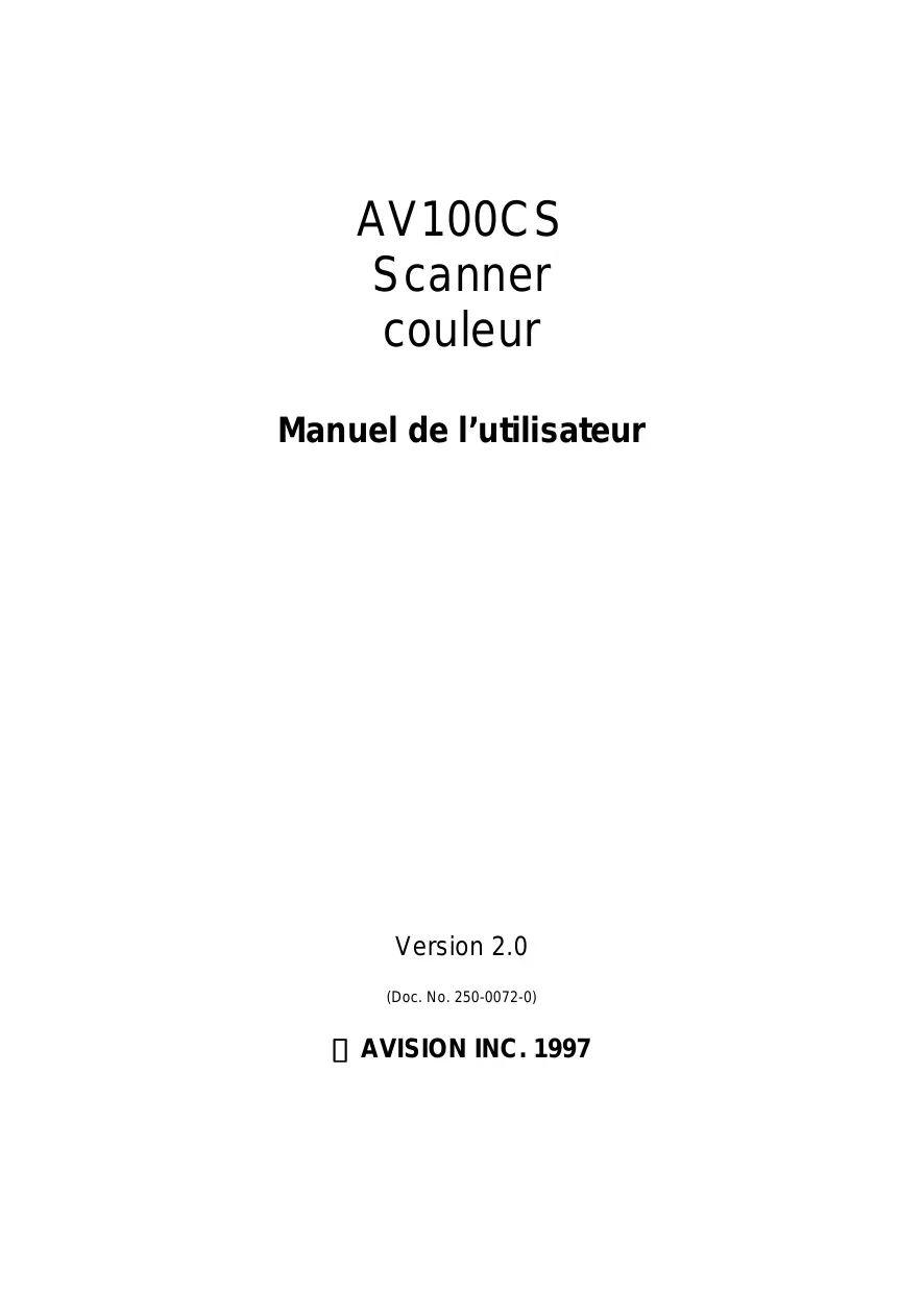 AV100CS Scanner couleur Manuel de l’utilisateur Version 2.0 (Doc. No. 250-0072-0) AVISION INC. 1997 Marques déposées Microsoft est une marque déposée aux Etats-Unis de Microsoft Corporation. Windows et MS DOS sont des marques de Microsoft Corporation. IBM, PC, AT, XT sont des marques déposées d’International Business Machines Corp. Les autres marques et produits cités sont des marques déposées ou des marques de leurs propriétaires respectifs. Droits d’auteurs Tous droits réservés. Aucune partie de cette publication ne peut être reproduite, transmise, transcrite, stockée dans un système d’archivage, ou traduite dans n’importe quelle langue ou n’importe quel langage de programmation, sous n’importe quelle forme ou par n’importe quels moyens, électroniques, mécaniques, magnétiques, optiques, chimiques, manuels, ou autres, sans la permission par écrit de Avision Inc. Le matériel scanné par ce produit peut être protégé par des lois gouvernementales et autres règlements, tel que lois de droits d’auteur. C’est l’unique responsabilité de l’utilisateur de se conformer à de telles lois et règlements.