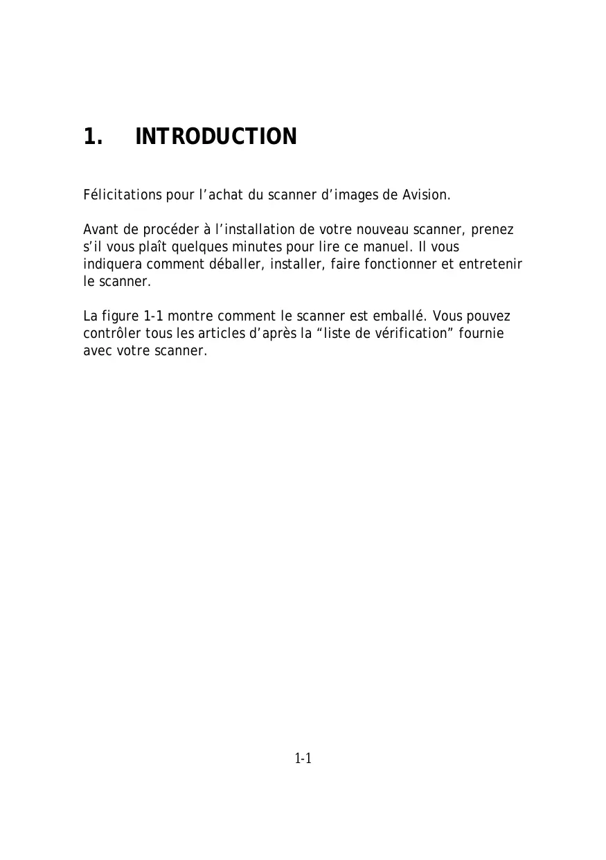 INTRODUCTION Félicitations pour l’achat du scanner d’images de Avision. Avant de procéder à l’installation de votre nouveau scanner, prenez s’il vous plaît quelques minutes pour lire ce manuel. Il vous indiquera comment déballer, installer, faire fonctionner et entretenir le scanner. La figure 1-1 montre comment le scanner est emballé. Vous pouvez contrôler tous les articles d’après la “liste de vérification” fournie avec votre scanner. 1-1