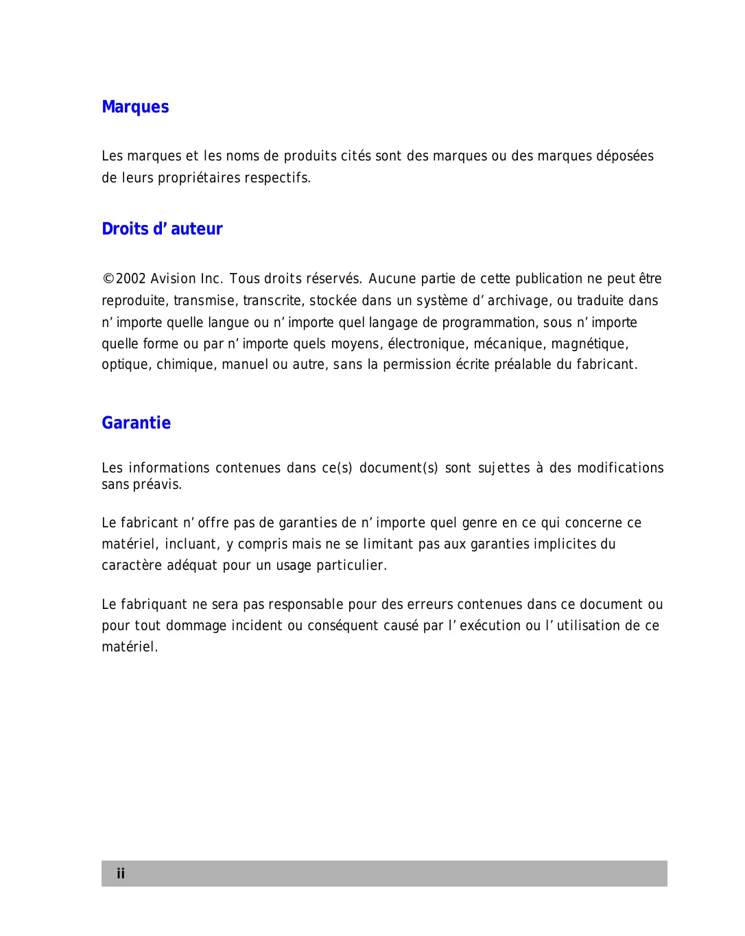 © 2002 Avision Inc. Tous droits réservés. Aucune partie de cette publication ne peut être reproductive, transmise, transcribe, stockée dans un système d'archivage, ou traduite dans n' importsque langue ou n' importe quel langage de programmation, sous n' importe qu'elle forme ou par n' importe quels moyens, électronique, mécanique, magnétique, optique, chimique, manuel ou autre, sans la permission écrite préalable du fabricant.