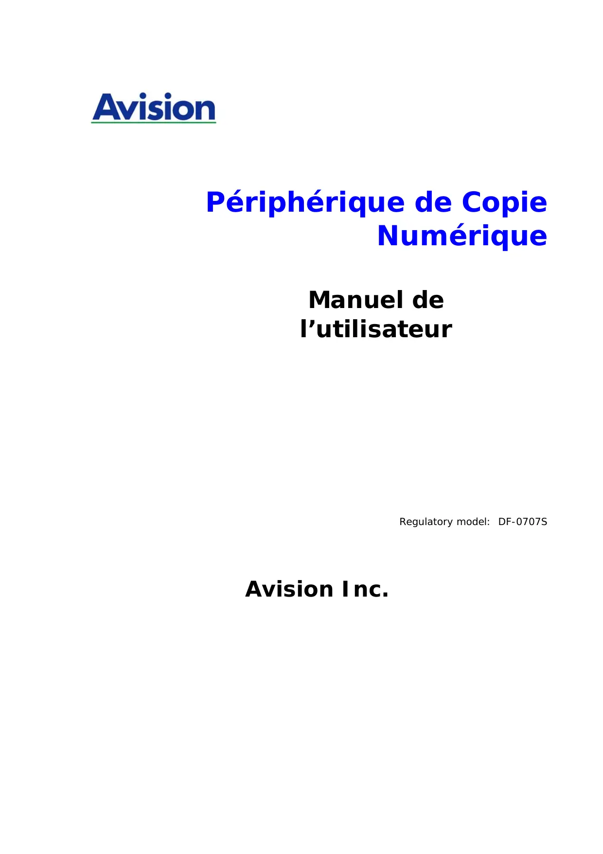 Périphérique de Copie Numérique Manuel de l’utilisateur Regulatory model: DF-0707S Avision Inc. Marques déposées Microsoft est une marque déposée aux Etats-Unis de Microsoft Corporation. Windows et MS DOS sont des marques de Microsoft Corporation. IBM, IBM PC sont des marques déposées d’International Business Machines Corp. Les autres marques et produits cités sont des marques déposées ou des marques de leurs propriétaires respectifs. Droits d’auteurs Tous droits réservés. Aucune partie de cette publication ne peut être reproduite, transmise, transcrite, stockée dans un système d’archivage, ou traduite dans n’importe quelle langue ou n’importe quel langage de programmation, sous n’importe quelle forme ou par n’importe quels moyens, électroniques, mécaniques, magnétiques, optiques, chimiques, manuels, ou autres, sans la permission par écrit de Avision Inc. Le matériel scanné par ce produit peut être protégé par des lois gouvernementales et autres règlements, tel que lois de droits d’auteur. C’est l’unique responsabilité de l’utilisateur de se conformer à de telles lois et règlements. Garantie Les informations contenues dans ce document sont sujettes à des modifications sans préavis. Avision ne fait pas de garantie de n’importe quel genre en ce qui concerne ce matériel, y compris, mais sans limitations, la garantie impliquée de convenance dans un but déterminé. Avision décline toute responsabilité pour toute erreur contenue ci-après, ou pour tout dommage accessoire ou indirect résultant de la fourniture, performance, ou utilisation de ce matériel.