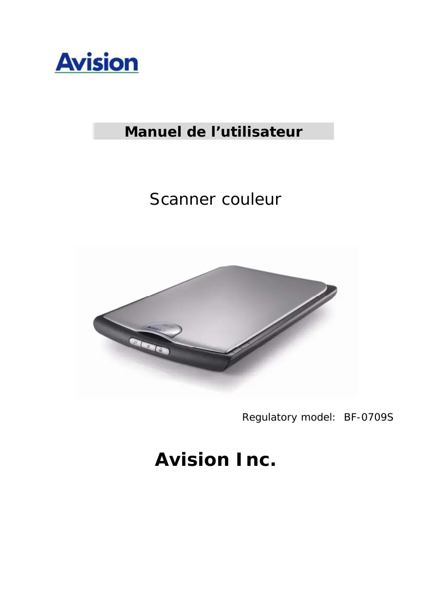 Manuel de l’utilisateur Scanner couleur Regulatory model: BF-0709S Avision Inc. Marques déposées Microsoft est une marque déposée aux Etats-Unis de Microsoft Corporation. Windows et MS DOS sont des marques de Microsoft Corporation. IBM, PC, AT, XT sont des marques déposées d’International Business Machines Corp. Les autres marques et produits cités sont des marques déposées ou des marques de leurs propriétaires respectifs. Droits d’auteurs Tous droits réservés. Aucune partie de cette publication ne peut être reproduite, transmise, transcrite, stockée dans un système d’archivage, ou traduite dans n’importe quelle langue ou n’importe quel langage de programmation, sous n’importe quelle forme ou par n’importe quels moyens, électroniques, mécaniques, magnétiques, optiques, chimiques, manuels, ou autres, sans la permission par écrit de Avision Inc. Le matériel scanné par ce produit peut être protégé par des lois gouvernementales et autres règlements, tel que lois de droits d’auteur. C’est l’unique responsabilité de l’utilisateur de se conformer à de telles lois et règlements. Garantie Les informations contenues dans ce document sont sujettes à des modifications sans préavis. Avision ne fait pas de garantie de n’importe quel genre en ce qui concerne ce matériel, y compris, mais sans limitations, la garantie impliquée de convenance dans un but déterminé. Avision décline toute responsabilité pour toute erreur contenue ciaprès, ou pour tout dommage accessoire ou indirect résultant de la fourniture, performance, ou utilisation de ce matériel.