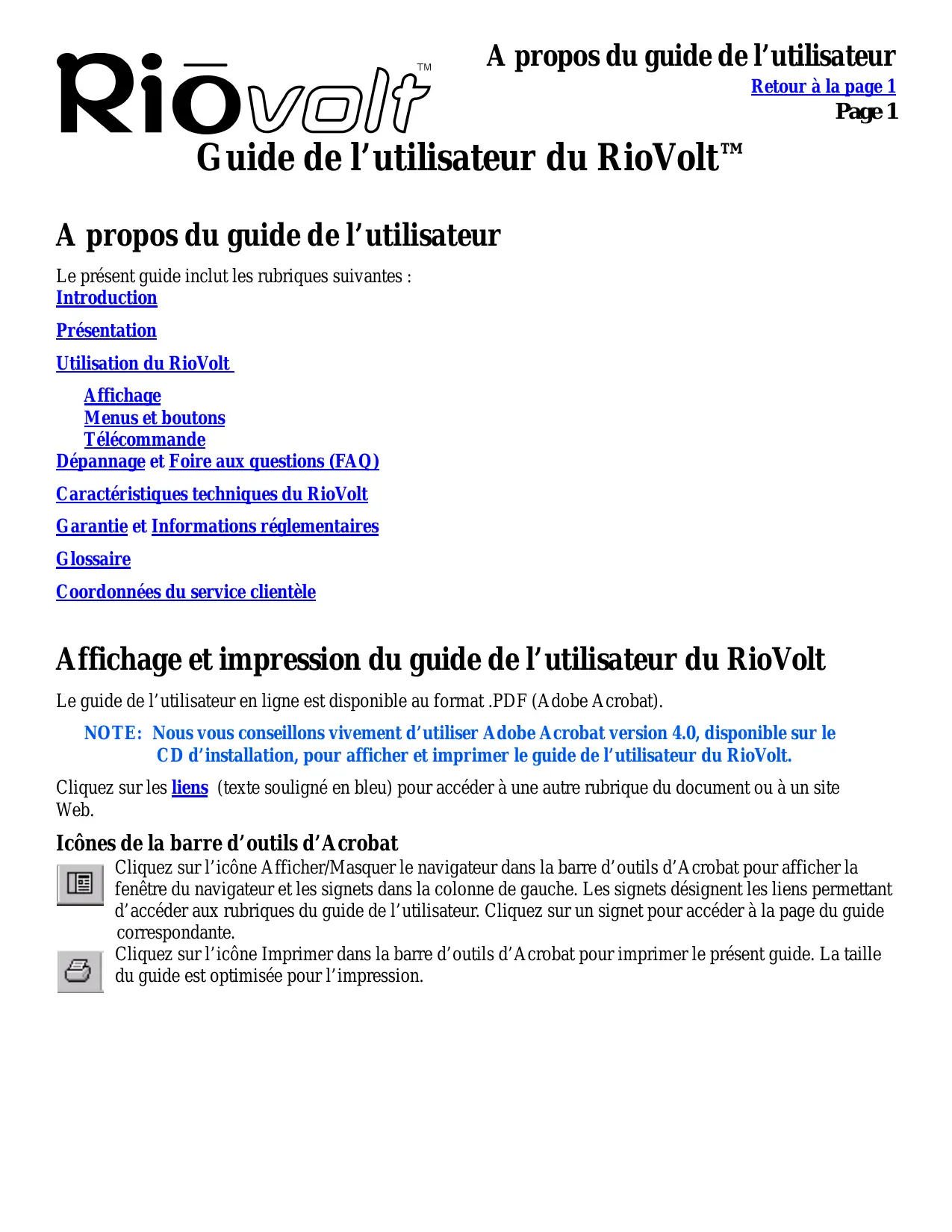 NOTE: Nous vous conseillons vivement d'utiliser Adobe Acrobat version 4.0, disponible sur le CD d'installation, pour afficher et imprimer le guide de l'utilisateur du RioVolt.