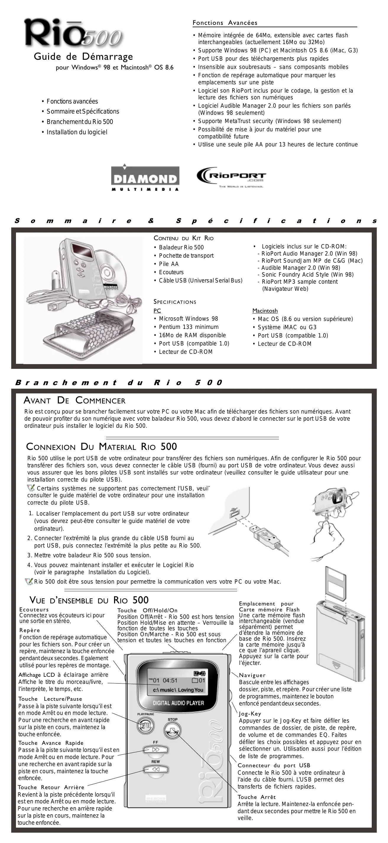 Rio est conçu pour se brancher facilement sur votre PC ou votre Mac afin de télécharger des fichiers son numériques. Avant de pouvoir profiter du son numérique avec votre baladeur Rio 500, vous doivent d'abord le connecter sur le port USB de votre ordinateur puis installer le logiciel du Rio 500.