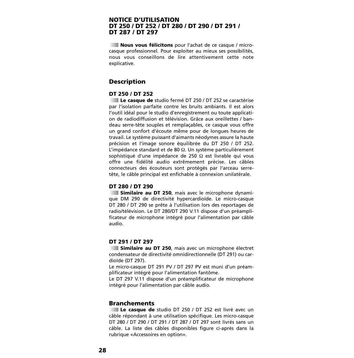 Le casque de studio DT 250 / DT 252 est livré avec un câble répondant à une utilisation spécifique. Les micro-casques DT 280 / DT 290 / DT 291 / DT 287 / DT 297 sont livrés sans câble. La liste des câbles disponibles figure ci-après dans la rubrique «Accessoires en option».