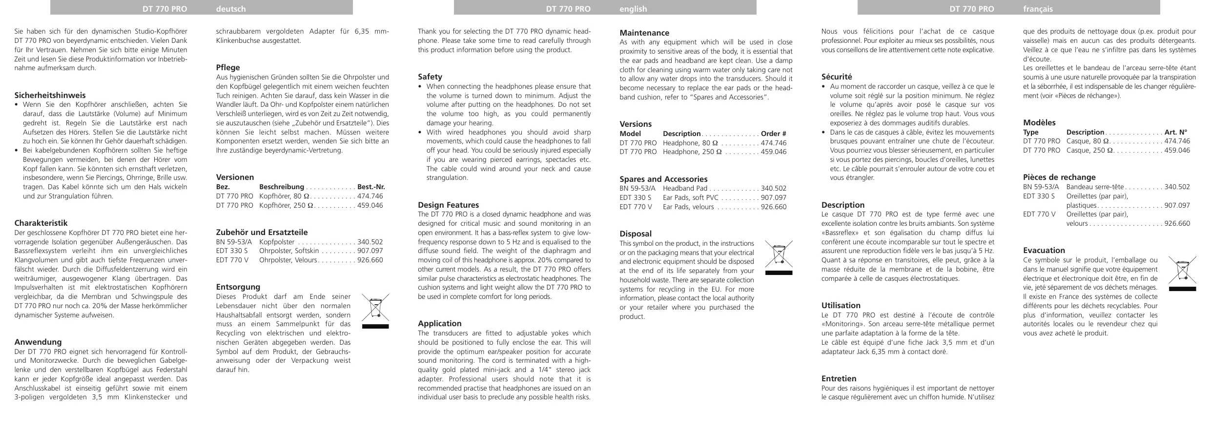 MODE D'EMPLOI DT 770 PRO BEYERDYNAMIC