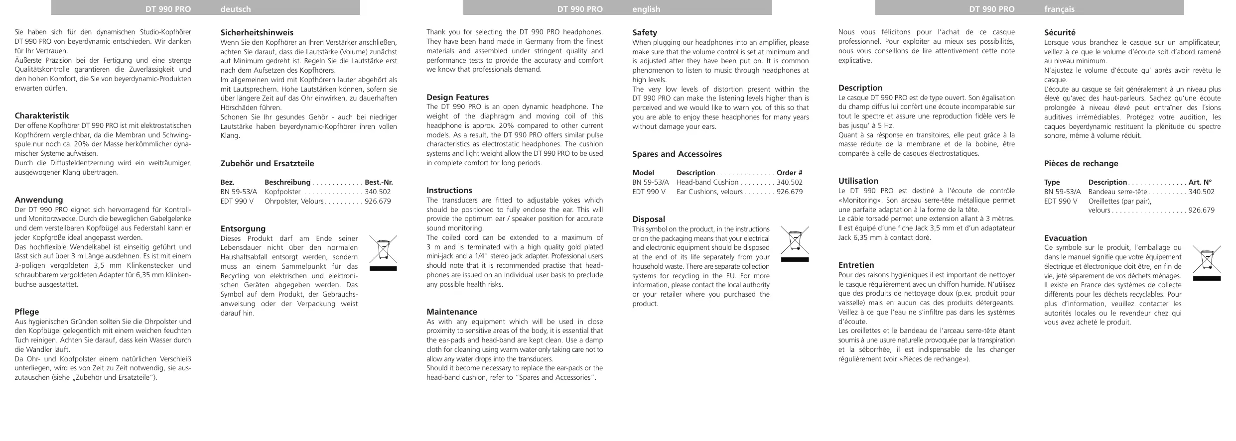 DT 990 PRO - Casque audio BEYERDYNAMIC - Notice d'utilisation et mode d'emploi gratuit