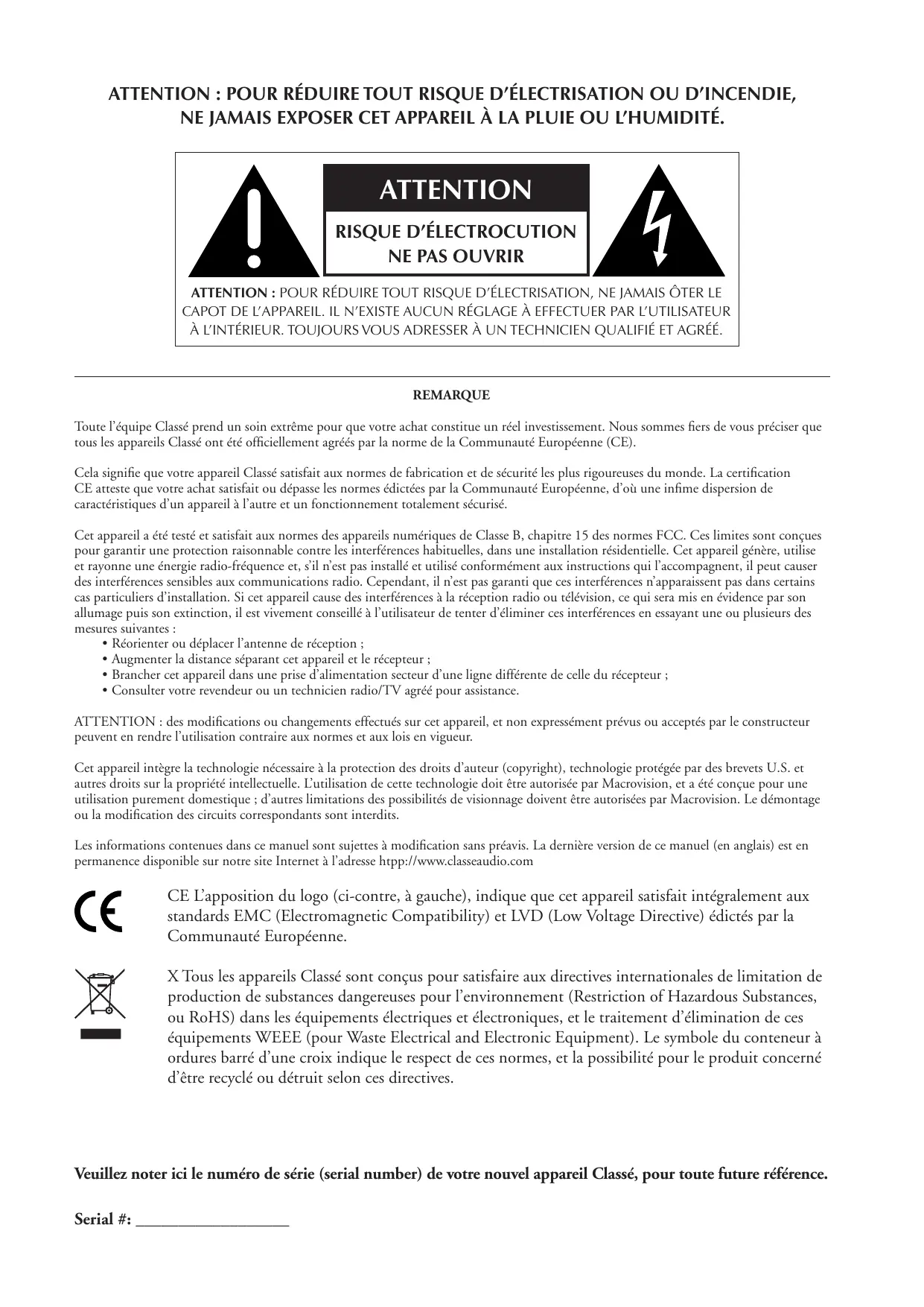 Veuillez noter ici le numero de série (serial number) de votre nouvel appeareil Classé, pour toute future reférence.