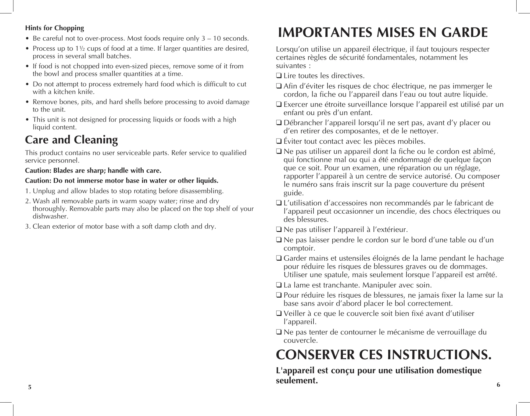 Lorsqu’on utilise un appareil électrique, il faut toujours respecter certaines règles de sécurité fondamentales, notamment les suivantes : ❑ Lire toutes les directives. ❑ Afin d’éviter les risques de choc électrique, ne pas immerger le cordon, la fiche ou l’appareil dans l’eau ou tout autre liquide. ❑ Exercer une étroite surveillance lorsque l’appareil est utilisé par un enfant ou près d’un enfant. ❑ Débrancher l’appareil lorsqu’il ne sert pas, avant d’y placer ou d’en retirer des composantes, et de le nettoyer. ❑ Éviter tout contact avec les pièces mobiles. ❑ Ne pas utiliser un appareil dont la fiche ou le cordon est abîmé, qui fonctionne mal ou qui a été endommagé de quelque façon que ce soit. Pour un examen, une réparation ou un réglage, rapporter l’appareil à un centre de service autorisé. Ou composer le numéro sans frais inscrit sur la page couverture du présent guide. ❑ L’utilisation d’accessoires non recommandés par le fabricant de l’appareil peut occasionner un incendie, des chocs électriques ou des blessures. ❑ Ne pas utiliser l’appareil à l’extérieur. ❑ Ne pas laisser pendre le cordon sur le bord d’une table ou d’un comptoir. ❑ Garder mains et ustensiles éloignés de la lame pendant le hachage pour réduire les risques de blessures graves ou de dommages. Utiliser une spatule, mais seulement lorsque l’appareil est arrêté. ❑ La lame est tranchante. Manipuler avec soin. ❑ Pour réduire les risques de blessures, ne jamais fixer la lame sur la base sans avoir d’abord placer le bol correctement. ❑ Veiller à ce que le couvercle soit bien fixé avant d’utiliser l’appareil. ❑ Ne pas tenter de contourner le mécanisme de verrouillage du couvercle. CONSERVER CES INSTRUCTIONS.