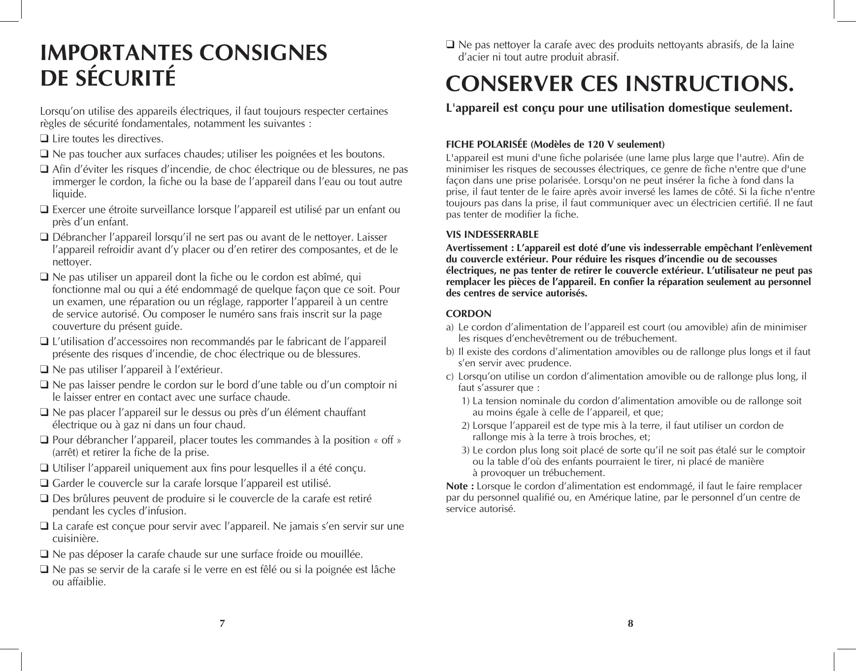 Lorsqu'on utilise des appareils électriques, il faut toujours respecter certaines règles de sécurité fondamentales, notamment les suivantes : Q Lire toutes les directives. Q Ne pas toucher aux surfaces chaudes; utiliser les poignées et les boutons. Q Afin d'éviter les risques d'incendie, de choc électrique ou de blessures, ne pas immerger le cordon, la fiche ou la base de l'appareil dans l’eau ou tout autre liquide. Q Exercer une étroite surveillance lorsque l'appareil est utilisé par un enfant ou près d’un enfant. Q Débrancher l'appareil lorsqu'il ne sert pas ou avant de le nettoyer. Laisser l'appareil refroidir avant d'y placer ou d'en retirer des composantes, et de le nettoyer. Q Ne pas utiliser un appareil dont la fiche ou le cordon est abîmé, qui fonctionne mal ou qui a été endommagé de quelque façon que ce soit. Pour un examen, une réparation ou un réglage, rapporter l’appareil à un centre de service autorisé. Ou composer le numéro sans frais inscrit sur la page couverture du présent guide. Q L'utilisation d'accessoires non recommandés par le fabricant de l'appareil présente des risques d'incendie, de choc électrique ou de blessures. Q Ne pas utiliser l'appareil à l'extérieur. Q Ne pas laisser pendre le cordon sur le bord d’une table ou d’un comptoir ni le laisser entrer en contact avec une surface chaude. Q Ne pas placer l'appareil sur le dessus ou près d'un élément chauffant électrique ou à gaz ni dans un four chaud. Q Pour débrancher l'appareil, placer toutes les commandes à la position « off » (arrêt) et retirer la fiche de la prise. Q Utiliser l'appareil uniquement aux fins pour lesquelles il a été conçu. Q Garder le couvercle sur la carafe lorsque l'appareil est utilisé. Q Des brûlures peuvent de produire si le couvercle de la carafe est retiré pendant les cycles d'infusion. Q La carafe est conçue pour servir avec l’appareil. Ne jamais s'en servir sur une cuisinière. Q Ne pas déposer la carafe chaude sur une surface froide où mouillée. Q Ne pas se servir de la carafe si le verre en est fêlé ou si la poignée est lâche où affaiblie. Q Ne pas nettoyer la carafe avec des produits nettoyants abrasifs, de la laine d'acier ni tout autre produit abrasif. CONSERVER CES INSTRUCTIONS. L'appareil est conçu pour une utilisation domestique seulement. FICHE POLARISÉE (Modèles de 120 V seulement) L'appareil est muni d'une fiche polarisée (une lame plus large que l'autre). Afin de minimiser les risques de secousses électriques, ce genre de fiche n'entre que d'une façon dans une prise polarisée. Lorsqu'on ne peut insérer la fiche à fond dans la prise, il faut tenter de le faire après avoir inversé les lames de côté. Si la fiche n'entre toujours pas dans la prise, il faut communiquer avec un électricien certifié. Il ne faut pas tenter de modifier la fiche. VIS INDESSERRABLE