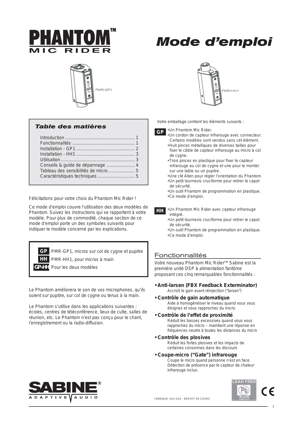 MODE D'EMPLOI PHANTOM MIC RIDER PMR-GP1 SABINE