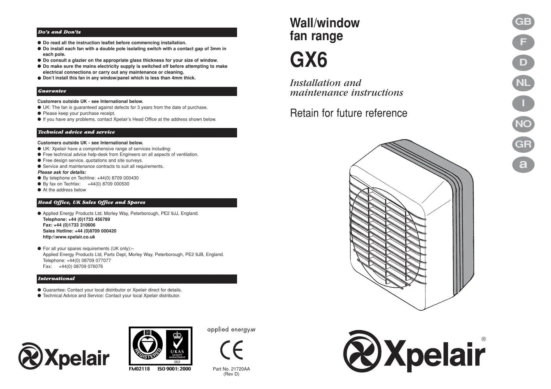 Pour toutes questions éventuelles avant ou après l'installation de ces produits, prière d'appeler le service Assistance Technique Xpelair au n° +44 (0) 8709 000430. Nos techniciens sont à votre disposition pour vous aider pendant les heures ouvrables (G. B. seulement), ou les envoyer par fax en dehors des heures ouvrables au n° +44 (0) 8709 000530.