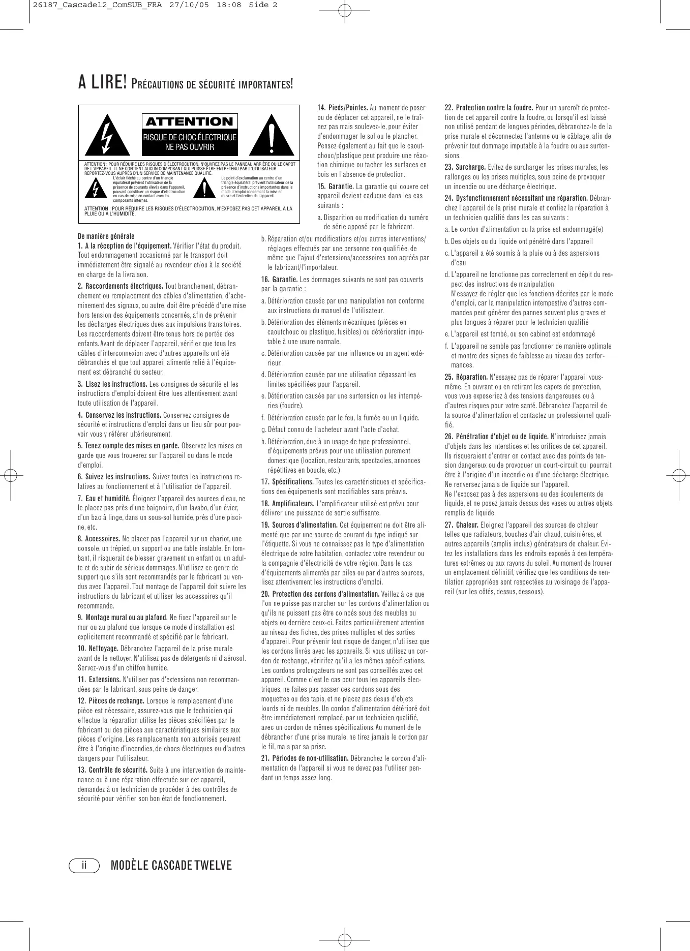 25. Réparation. N'essayez pas de réparer l'appareil vous-même. En ouvrant ou en retirant les capots de protection, vous vous exposeriez à des tensions dangereuses ou à autres risques pour votre santé. Debranchez l'appareil de la source d'alimentation et contactez un professionneliel reliéfie.