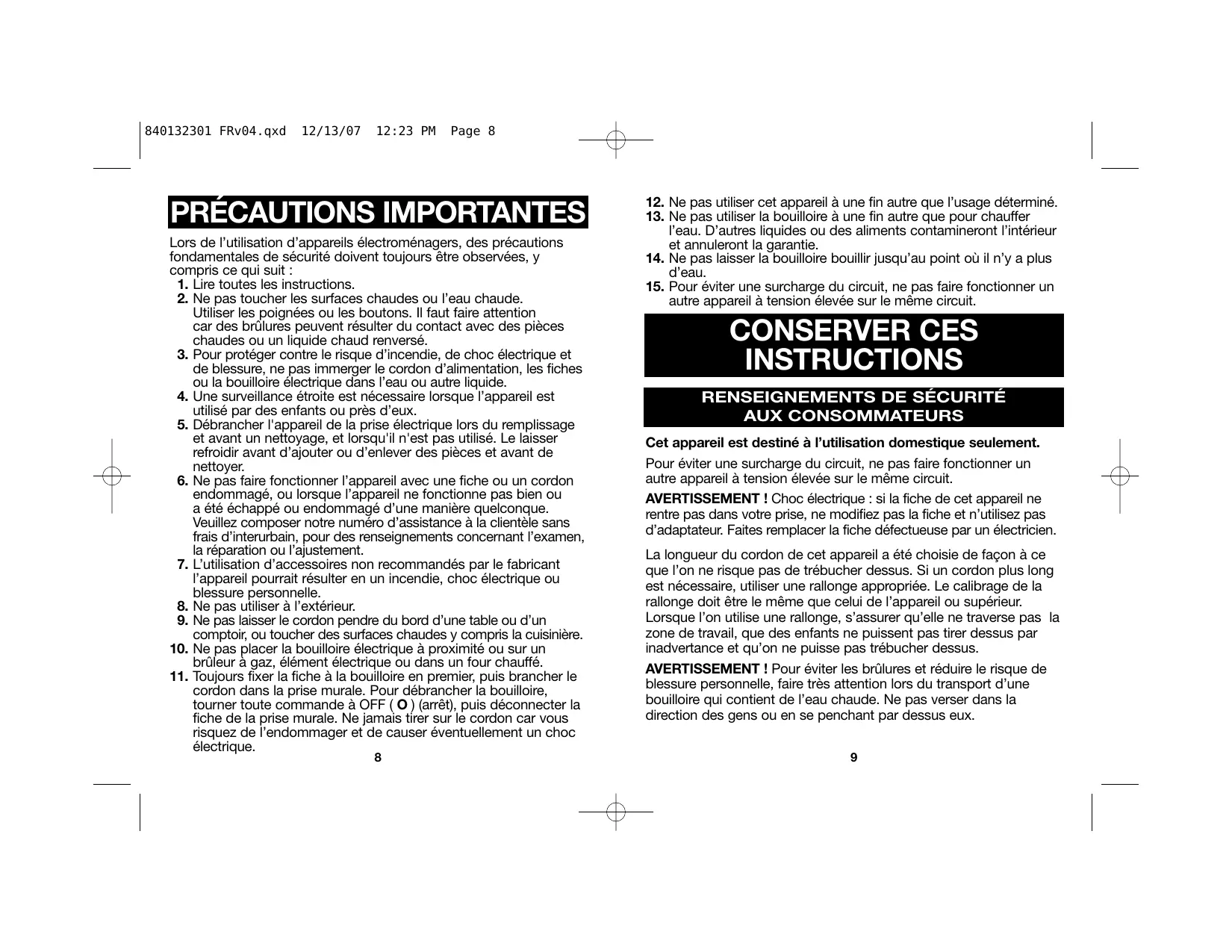 Toujours fixer la fiche à la bouilloire en premier, puis brancher le cordon dans la prise murale. Pour débrancher la bouilloire, tourner toute commande à OFF (O) (arrêt), puis déconnecter la fiche de la prise murale. Ne jamais tirer sur le cordon car vous risquez de l'endommager et de causeur évientuèlement un choc électrique.