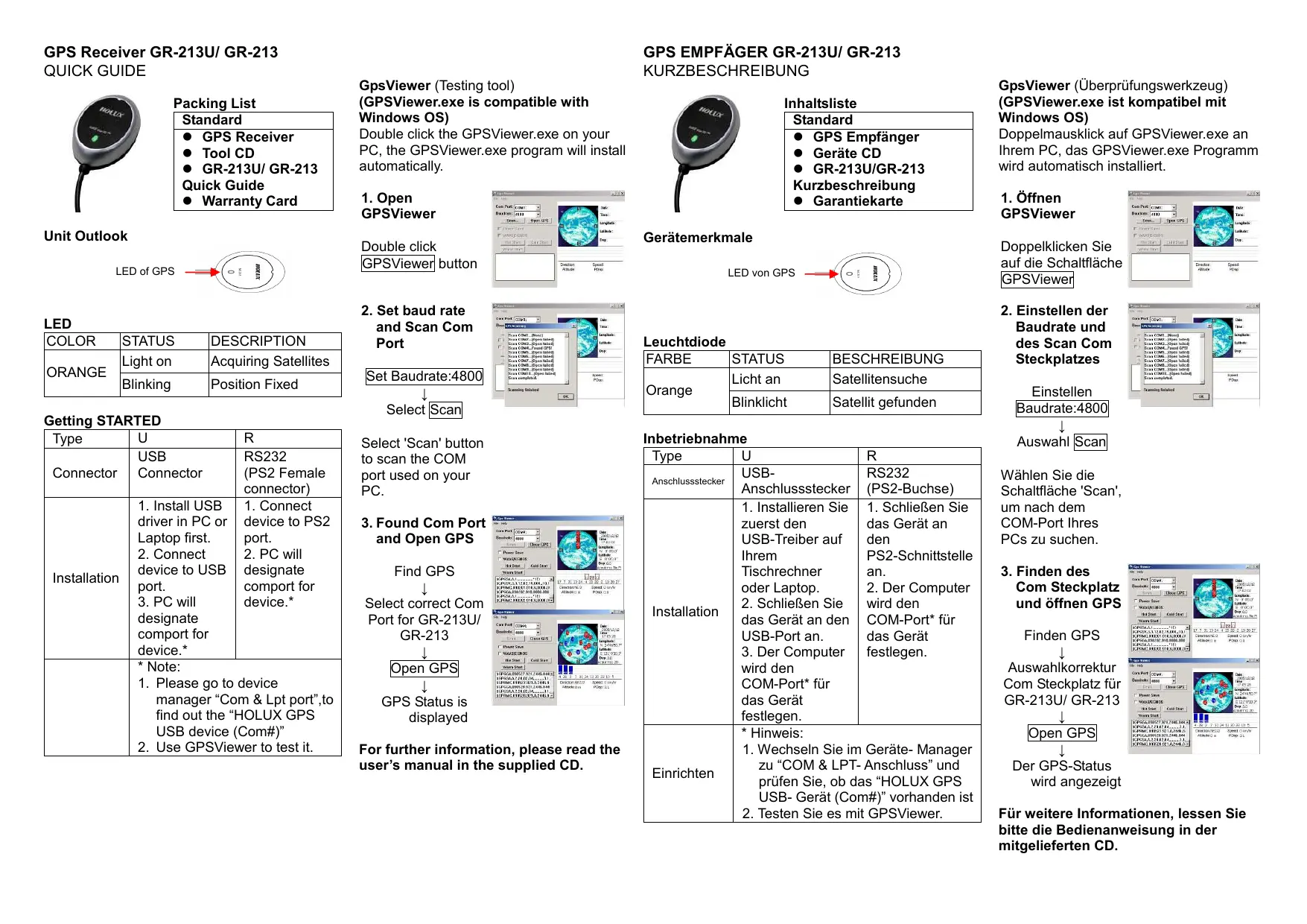 | Installation | * Remarques: 1. Allez sur « Port COM & LPT » dans le gestionnaire de périphériques et vérifie si le périphérique HOLUX GPS USB (Com#) est présente. 2. Utilisez GPSViewer pour le tester. | |